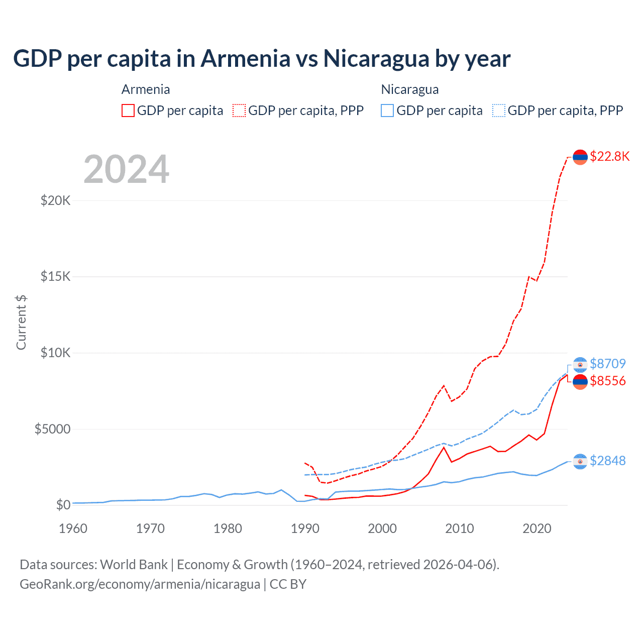GDP per capita in Armenia vs Nicaragua by year