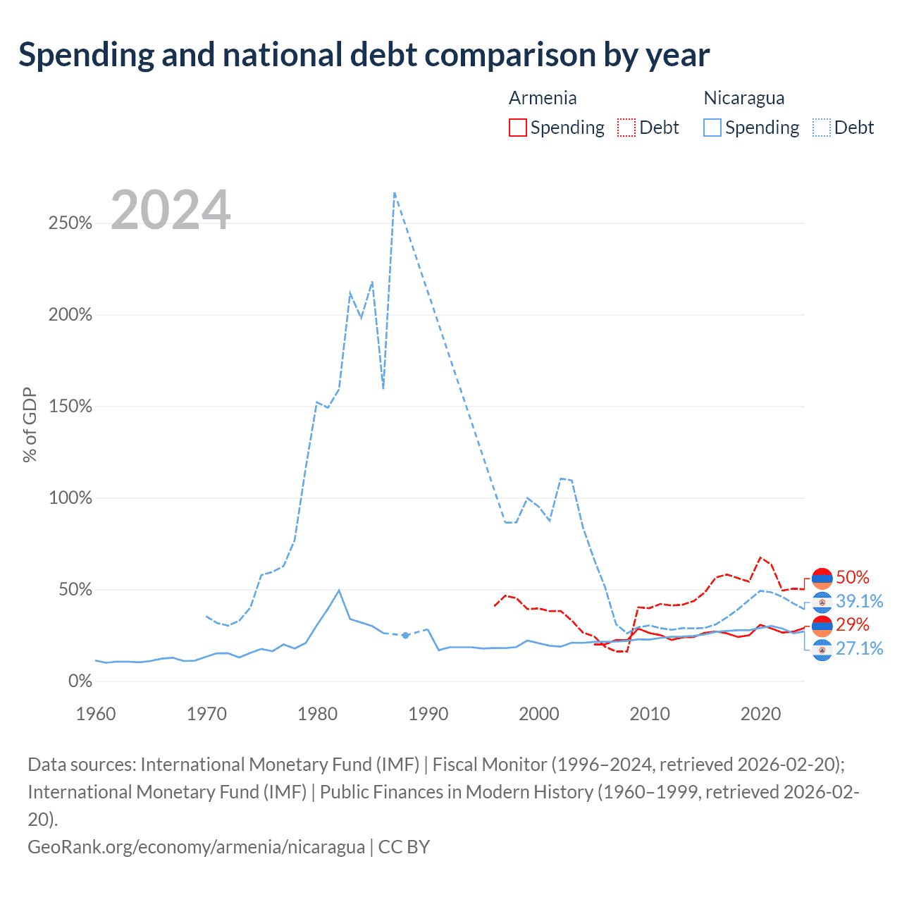 Armenia has $13B in government debt (50% of GDP), compared to $7.71B (39.1% of GDP) in Nicaragua.