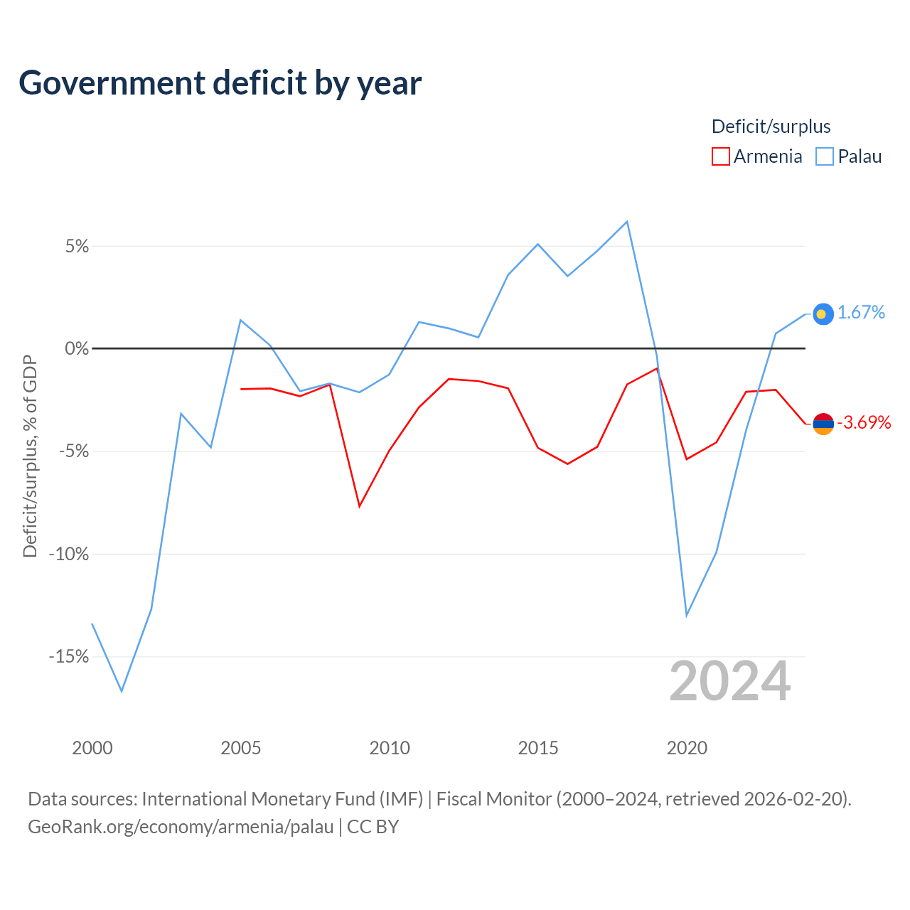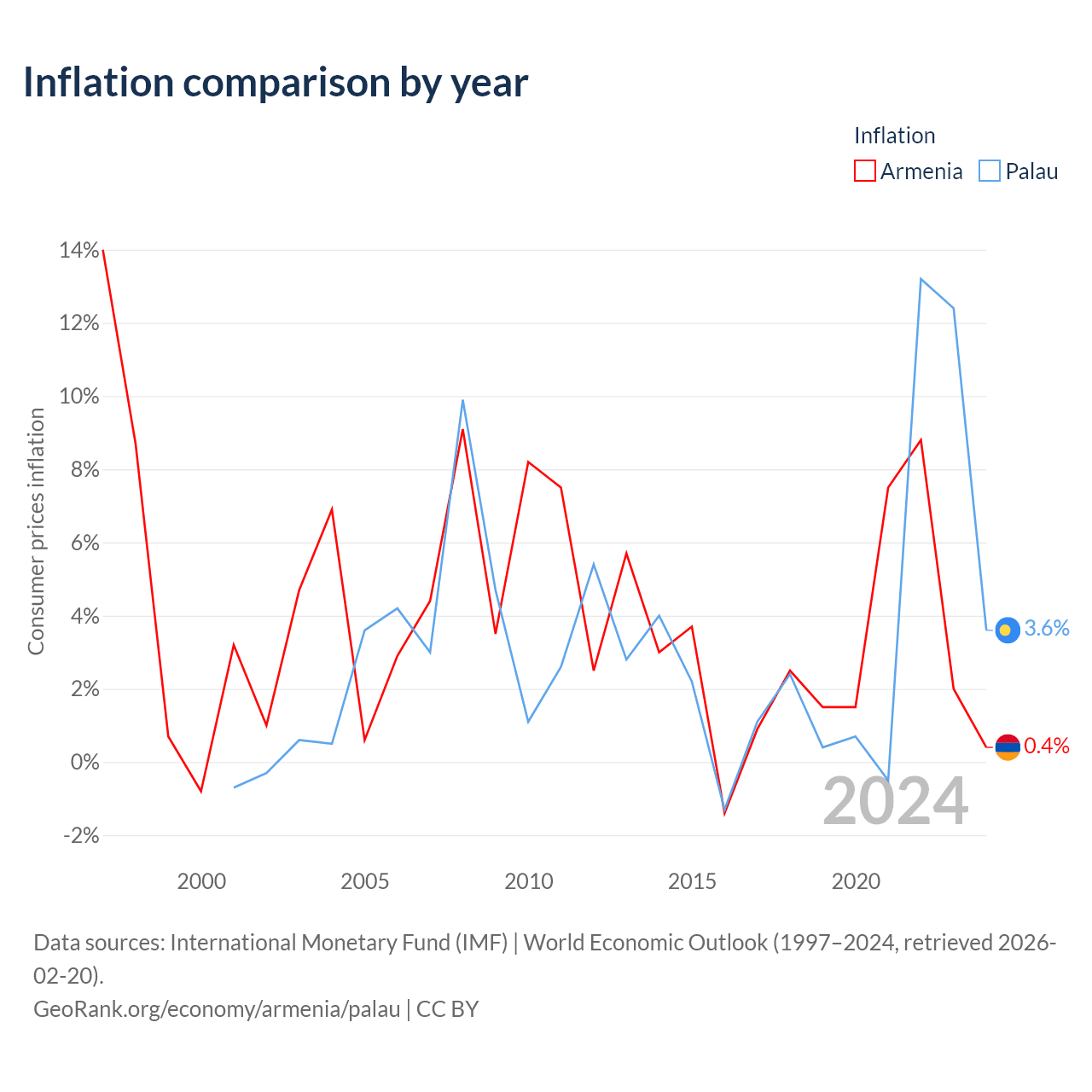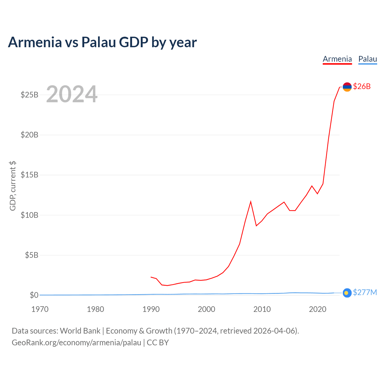 Armenia has a GDP of $26B compared to $277M for Palau, ranking 114/197 and 194/197 by economy size, respectively.