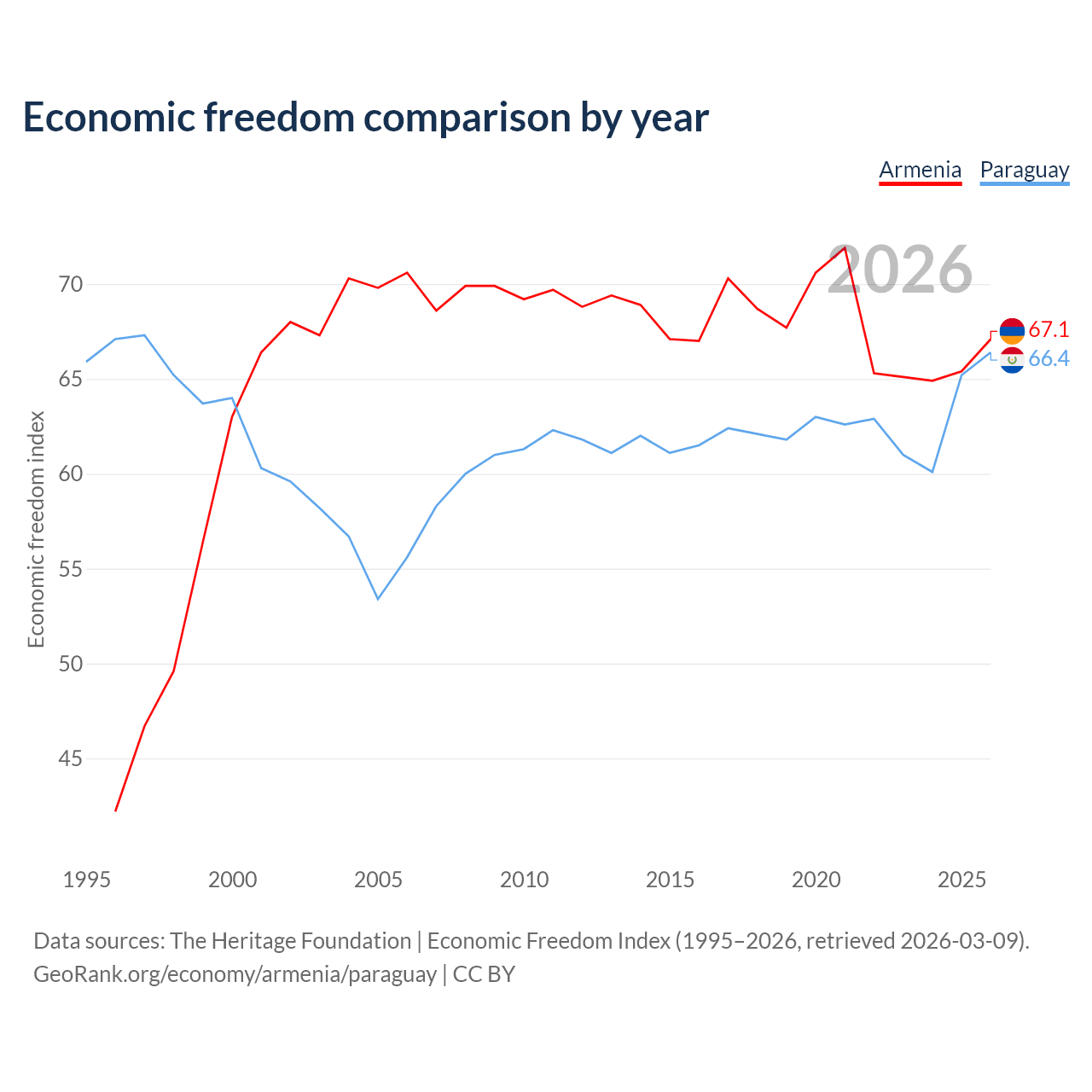 The Economic Freedom Index for Armenia is 67.1, ranking 58/197, compared to 66.4 for Paraguay, ranking 61/197. The chart above displays a comparison of annual changes in economic freedom indexes.