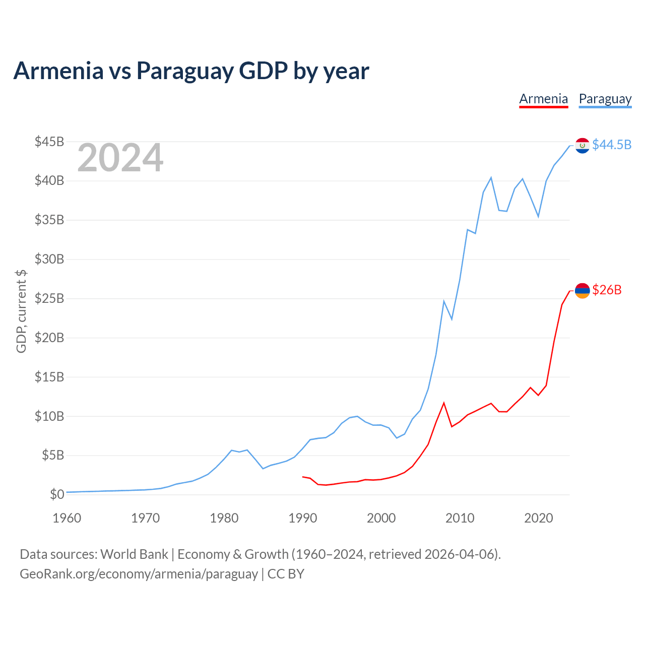 Armenia has a GDP of $26B compared to $44.5B for Paraguay, ranking 114/197 and 98/197 by economy size, respectively.