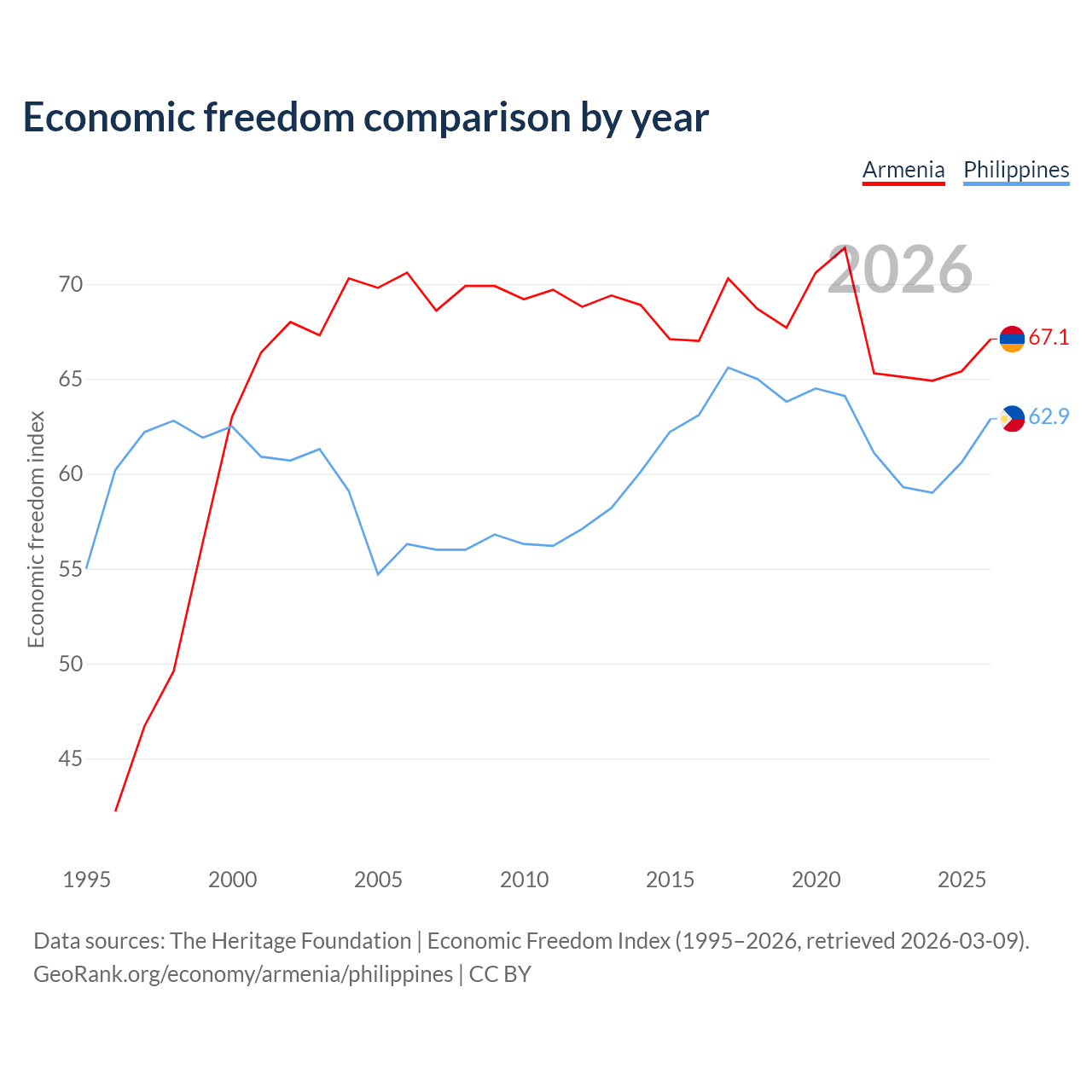 The Economic Freedom Index for Armenia is 67.1, ranking 58/197, compared to 62.9 for the Philippines, ranking 85/197. The chart above displays a comparison of annual changes in economic freedom indexes.