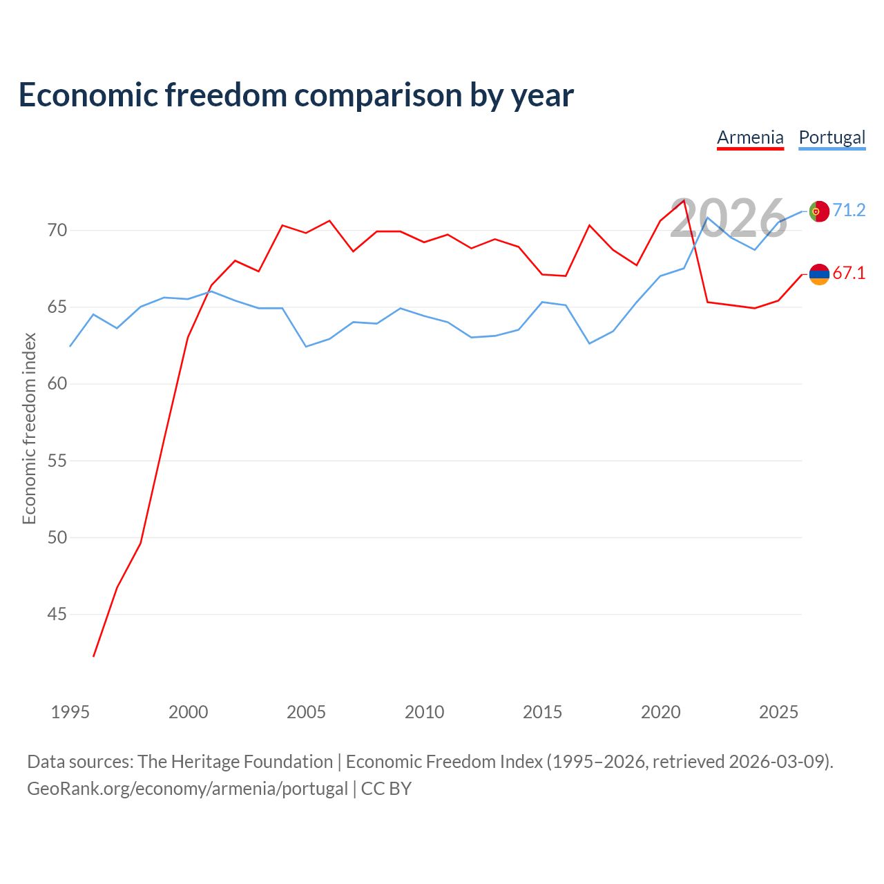The Economic Freedom Index for Armenia is 67.1, ranking 58/197, compared to 71.2 for Portugal, ranking 33/197. The chart above displays a comparison of annual changes in economic freedom indexes.