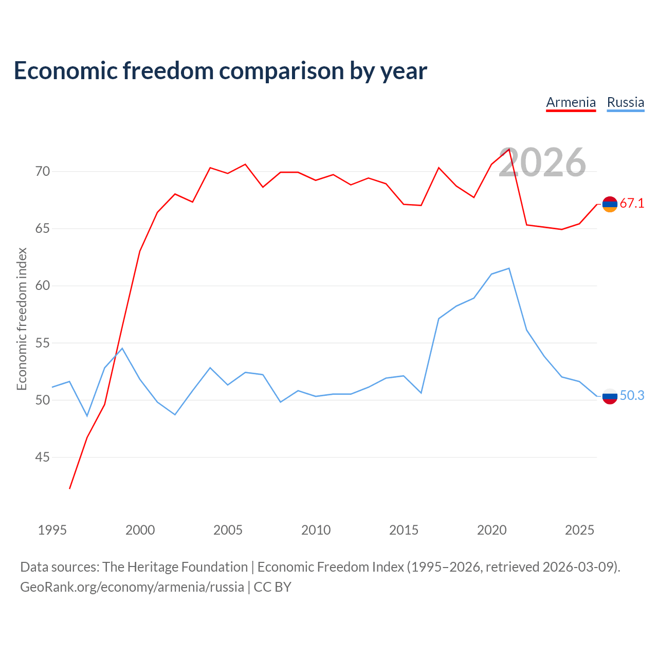 The Economic Freedom Index for Armenia is 67.1, ranking 58/197, compared to 50.3 for Russia, ranking 161/197. The chart above displays a comparison of annual changes in economic freedom indexes.