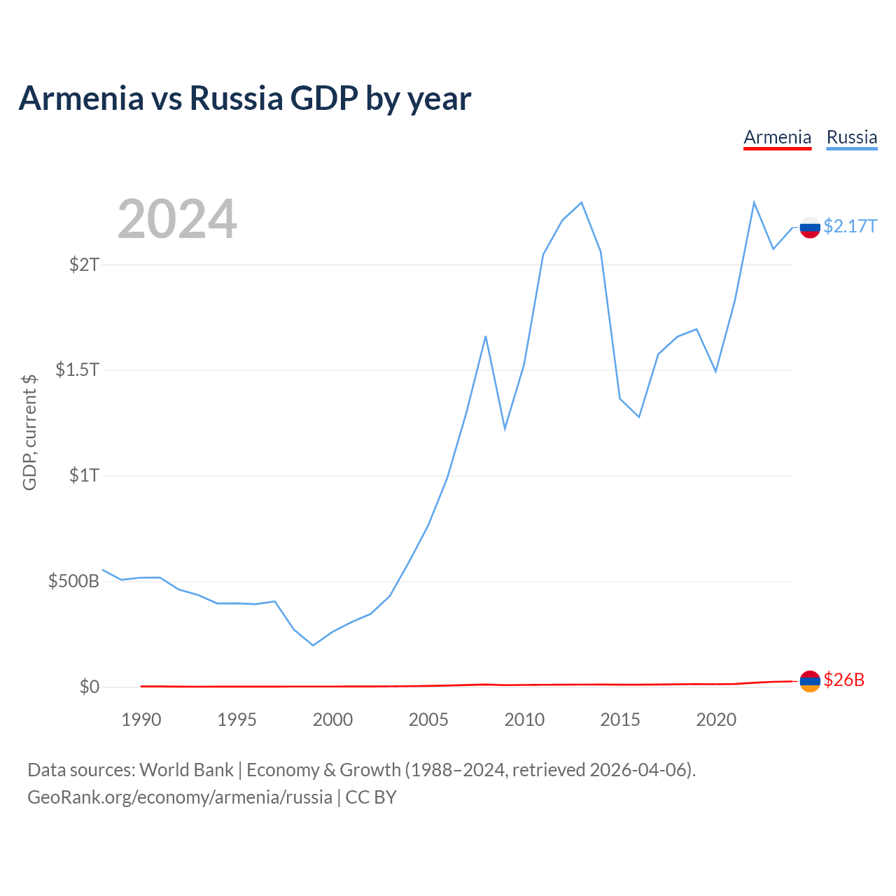 Armenia has a GDP of $26B compared to $2.17T for Russia, ranking 114/197 and 11/197 by economy size, respectively.