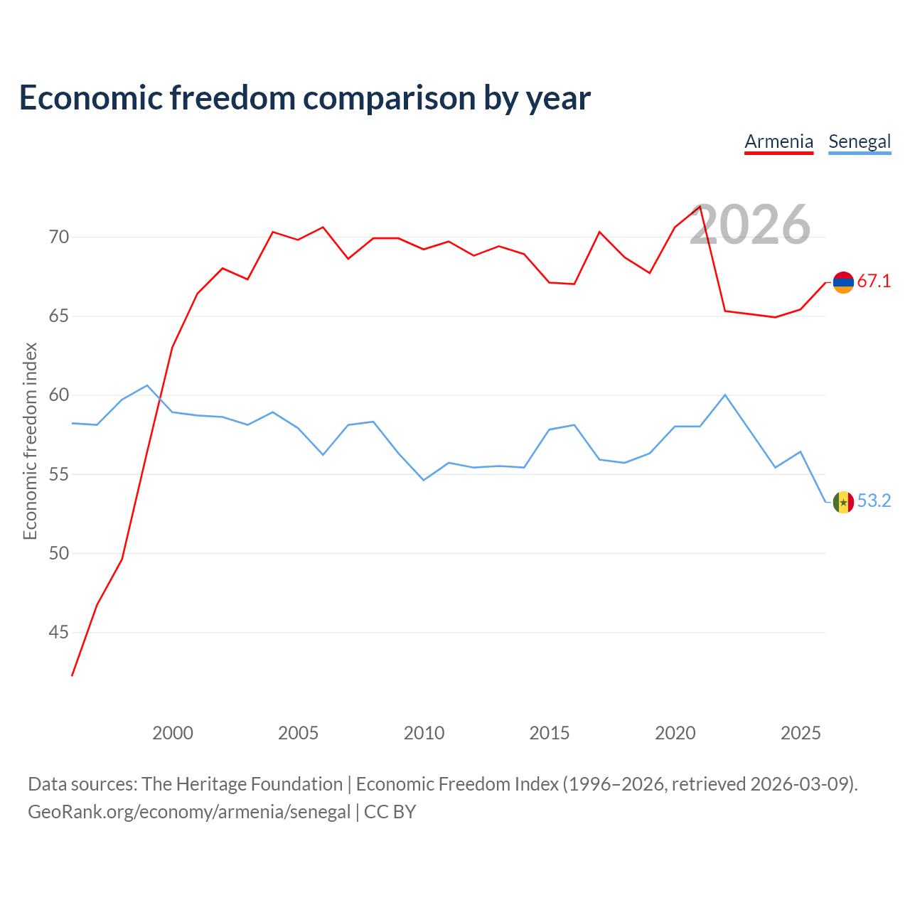 The Economic Freedom Index for Armenia is 67.1, ranking 58/197, compared to 53.2 for Senegal, ranking 140/197. The chart above displays a comparison of annual changes in economic freedom indexes.