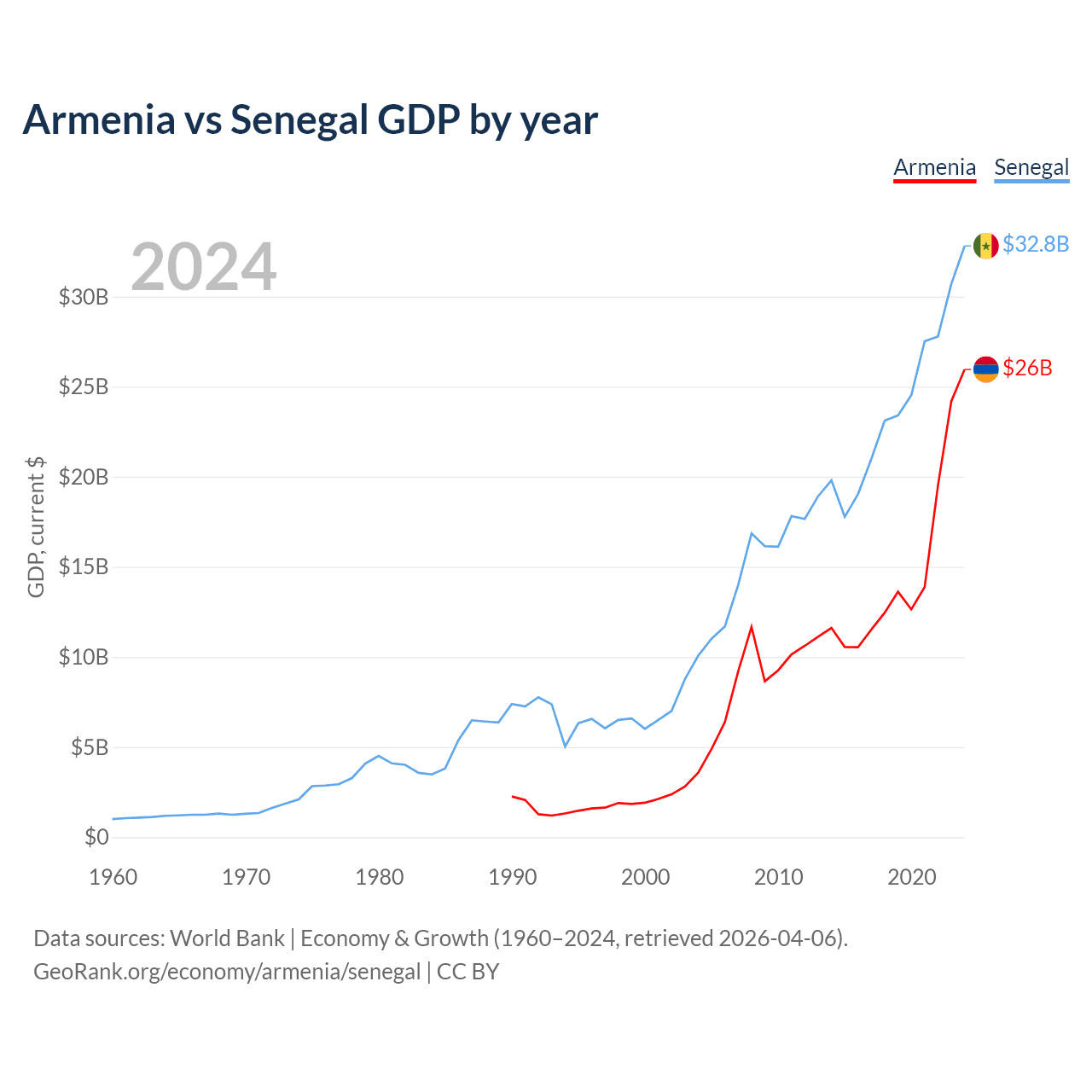 Armenia vs Senegal GDP by year