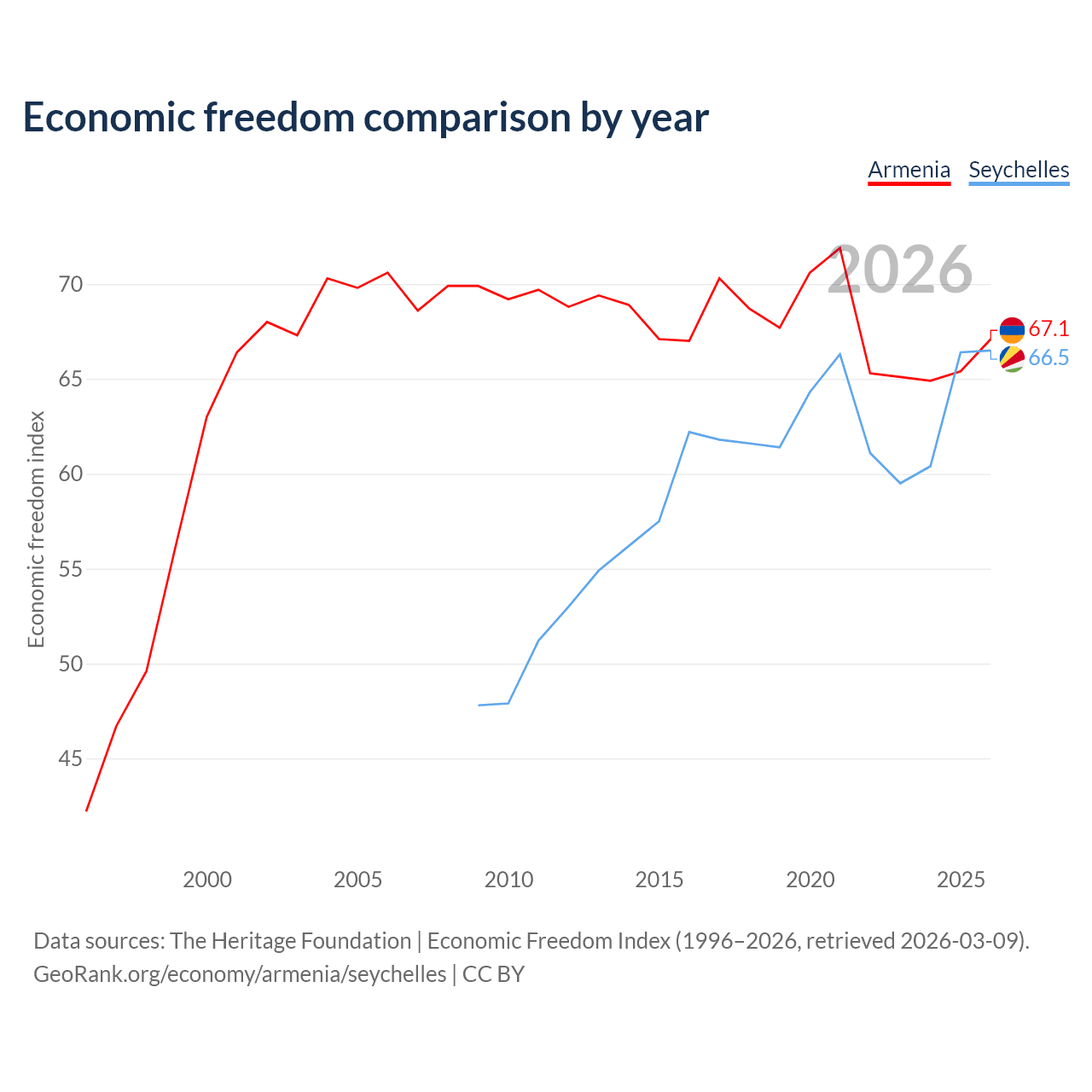 The Economic Freedom Index for Armenia is 67.1, ranking 58/197, compared to 66.5 for the Seychelles, ranking 60/197. The chart above displays a comparison of annual changes in economic freedom indexes.