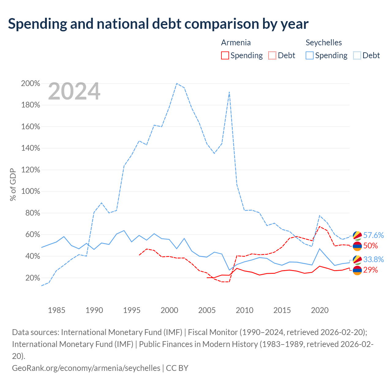 Armenia has $13B in government debt (50% of GDP), compared to $1.25B (57.6% of GDP) in the Seychelles.