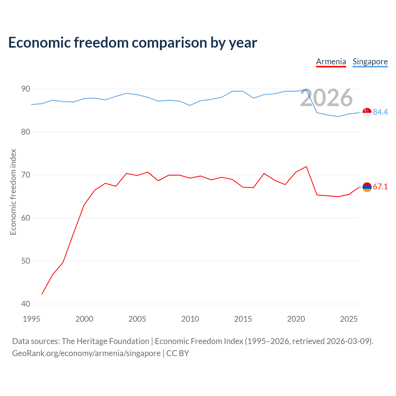 The Economic Freedom Index for Armenia is 67.1, ranking 58/197, compared to 84.4 for Singapore, ranking 1/197. The chart above displays a comparison of annual changes in economic freedom indexes.