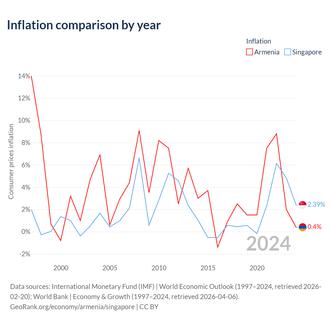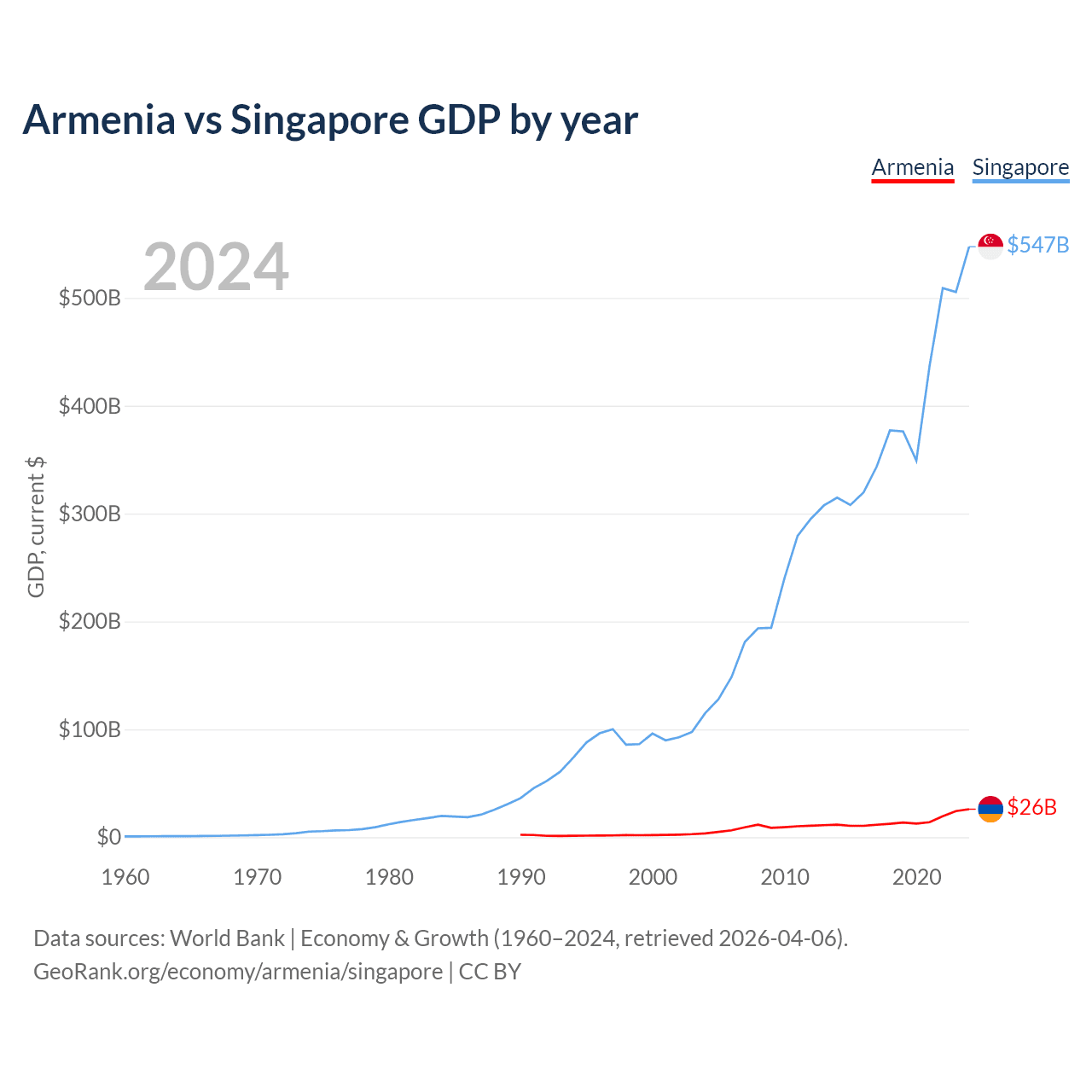Armenia has a GDP of $26B compared to $547B for Singapore, ranking 114/197 and 28/197 by economy size, respectively.