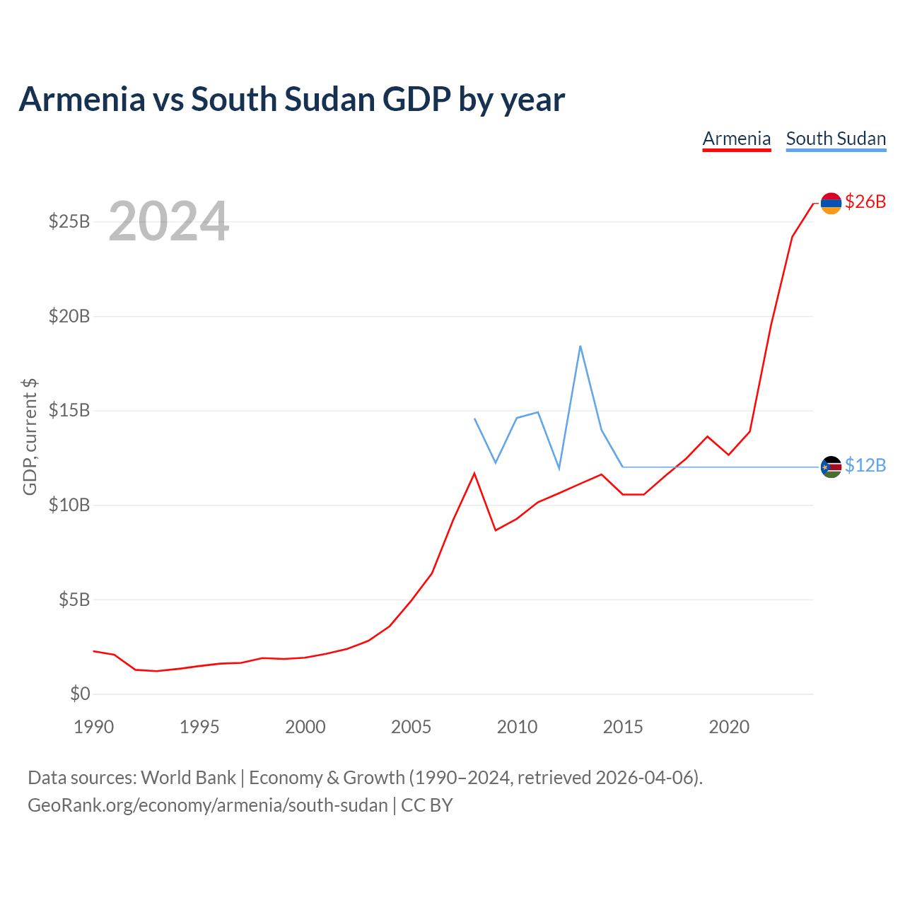 Armenia has a GDP of $26B compared to $12B for South Sudan, ranking 114/197 and 149/197 by economy size, respectively.