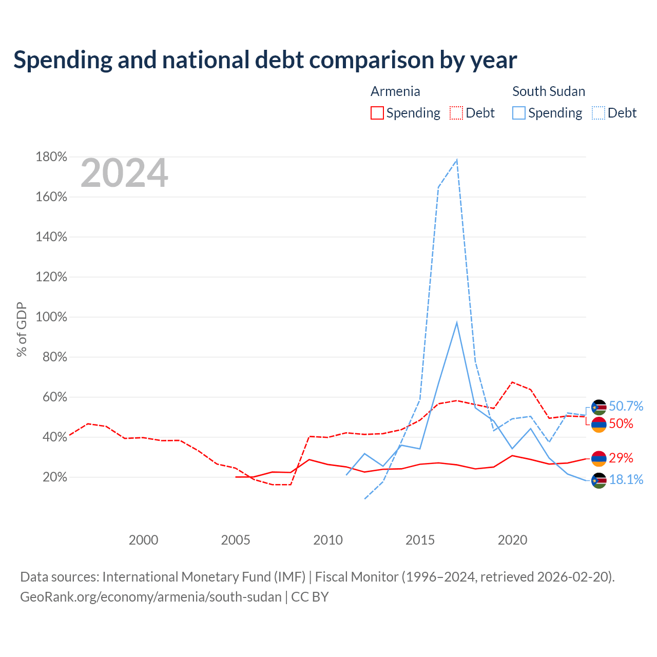 Armenia has $13B in government debt (50% of GDP), compared to $7.04B (50.7% of GDP) in South Sudan.