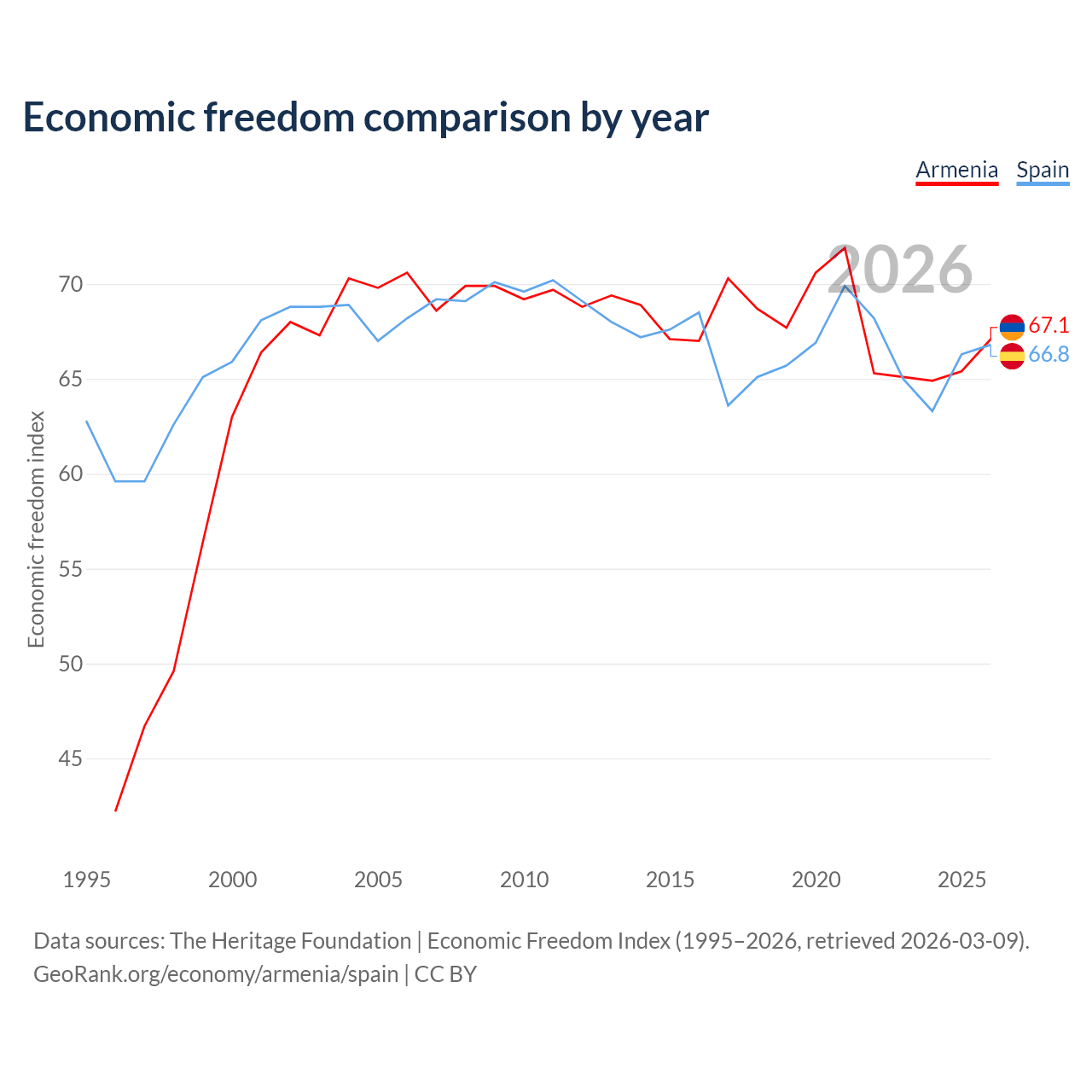 The Economic Freedom Index for Armenia is 67.1, ranking 58/197, compared to 66.8 for Spain, ranking 59/197. The chart above displays a comparison of annual changes in economic freedom indexes.