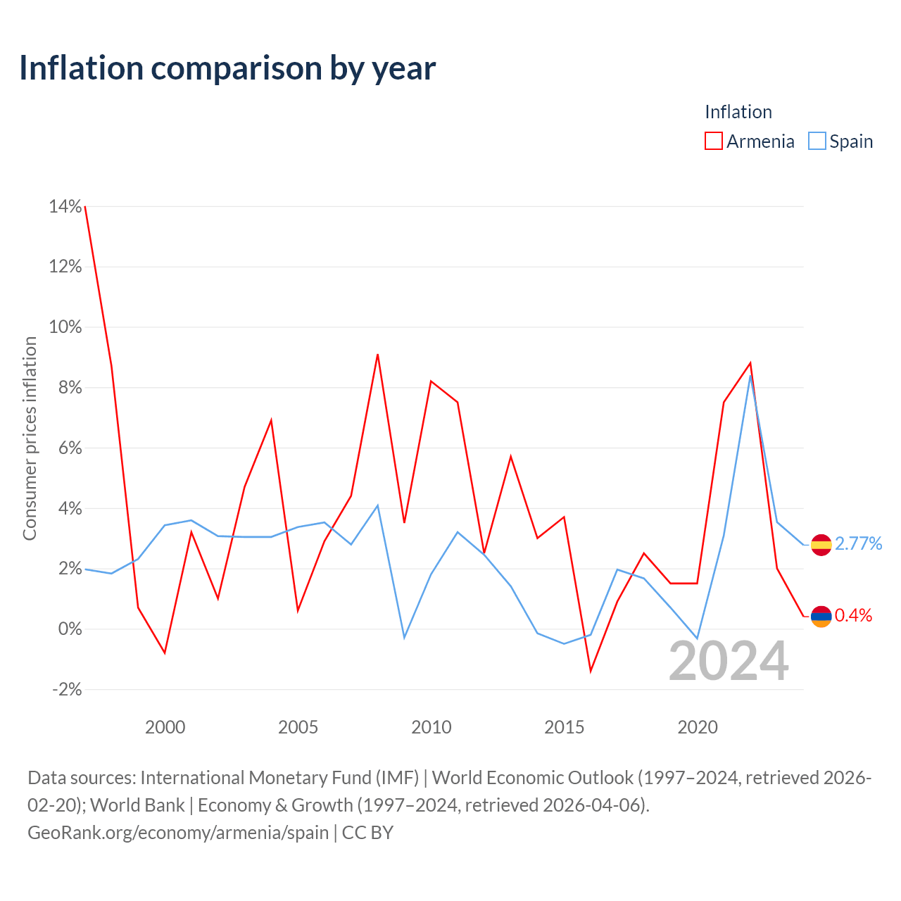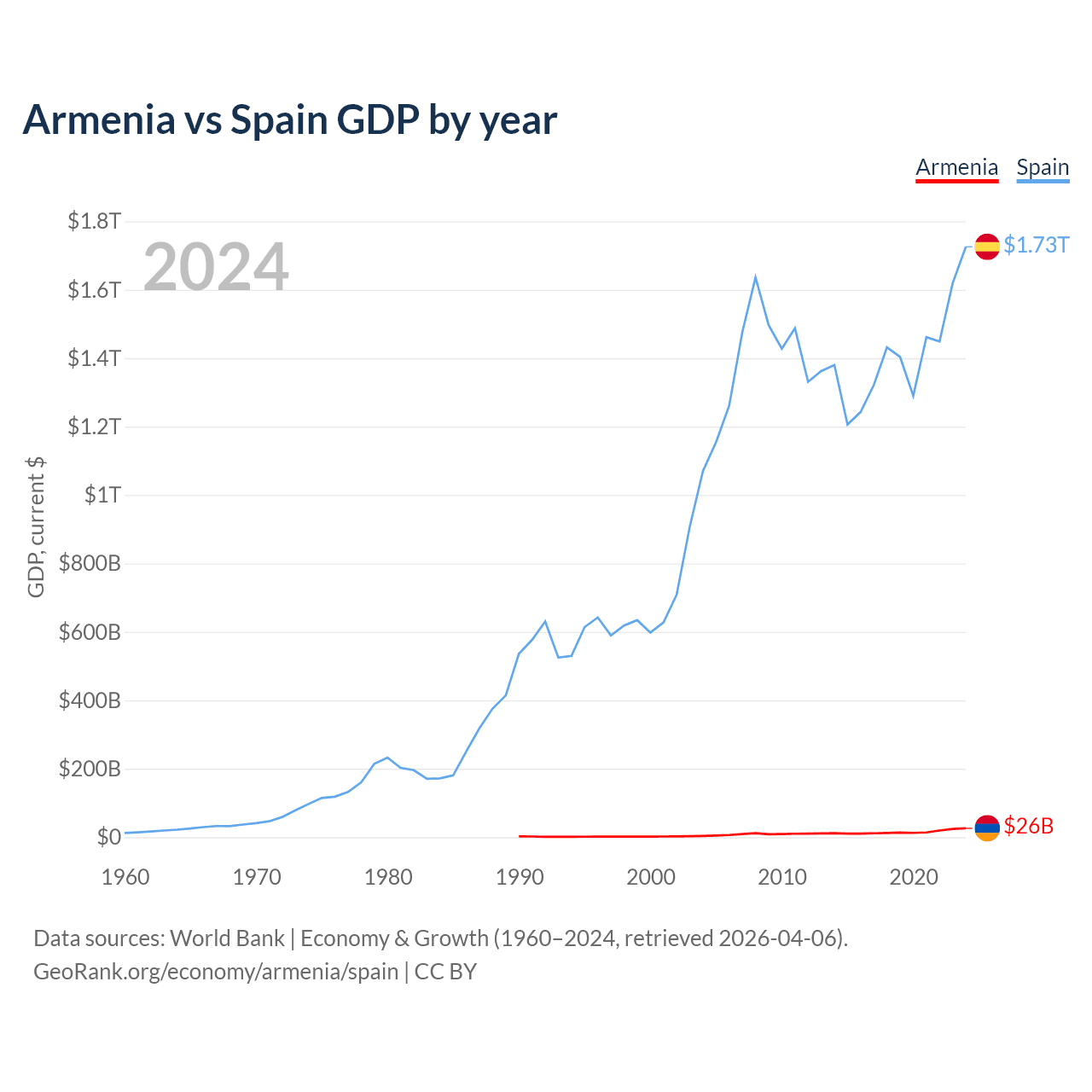 Armenia has a GDP of $26B compared to $1.73T for Spain, ranking 114/197 and 15/197 by economy size, respectively.