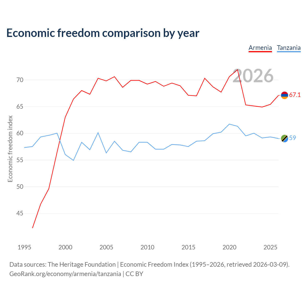 The Economic Freedom Index for Armenia is 67.1, ranking 58/197, compared to 59 for Tanzania, ranking 106/197. The chart above displays a comparison of annual changes in economic freedom indexes.