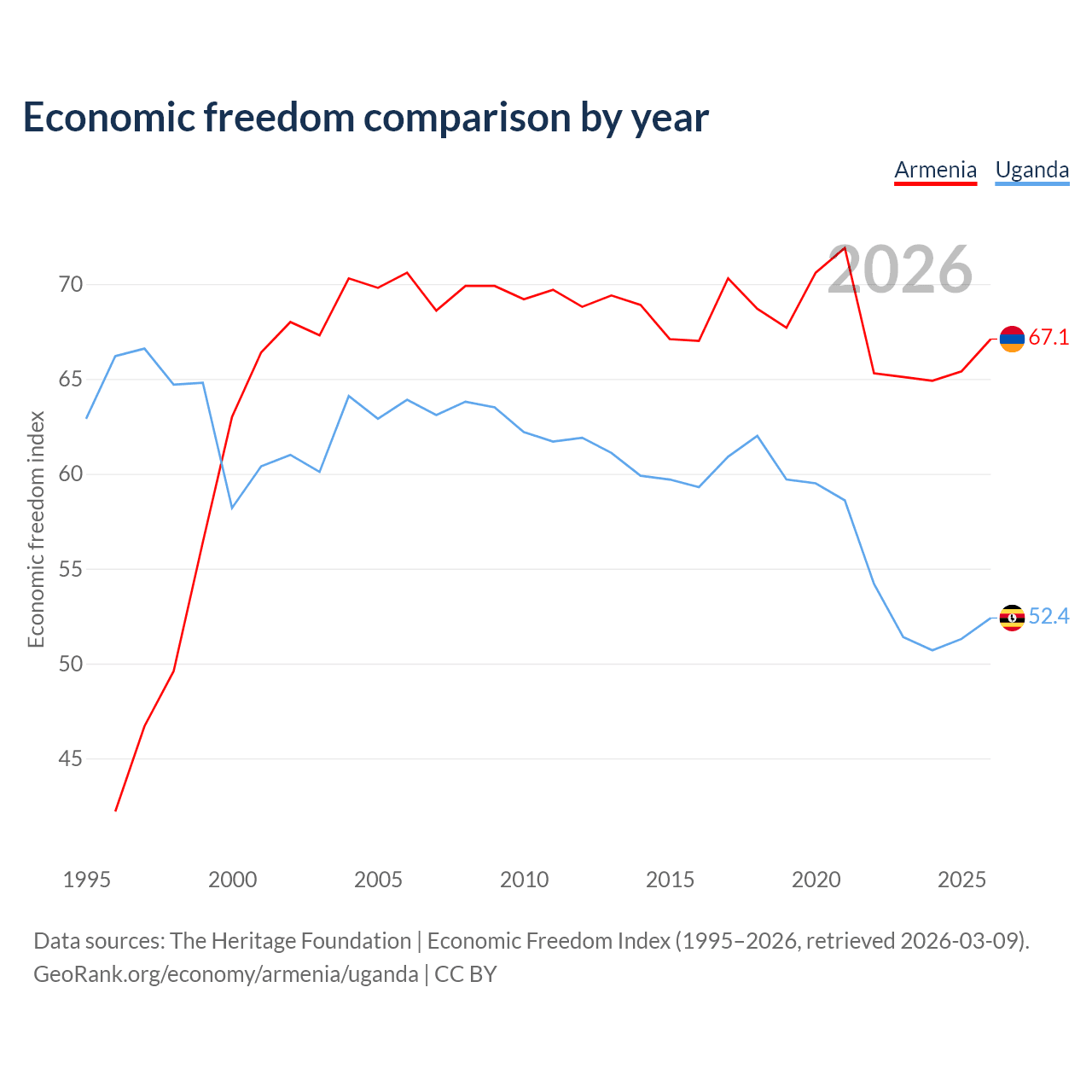 The Economic Freedom Index for Armenia is 67.1, ranking 58/197, compared to 52.4 for Uganda, ranking 149/197. The chart above displays a comparison of annual changes in economic freedom indexes.