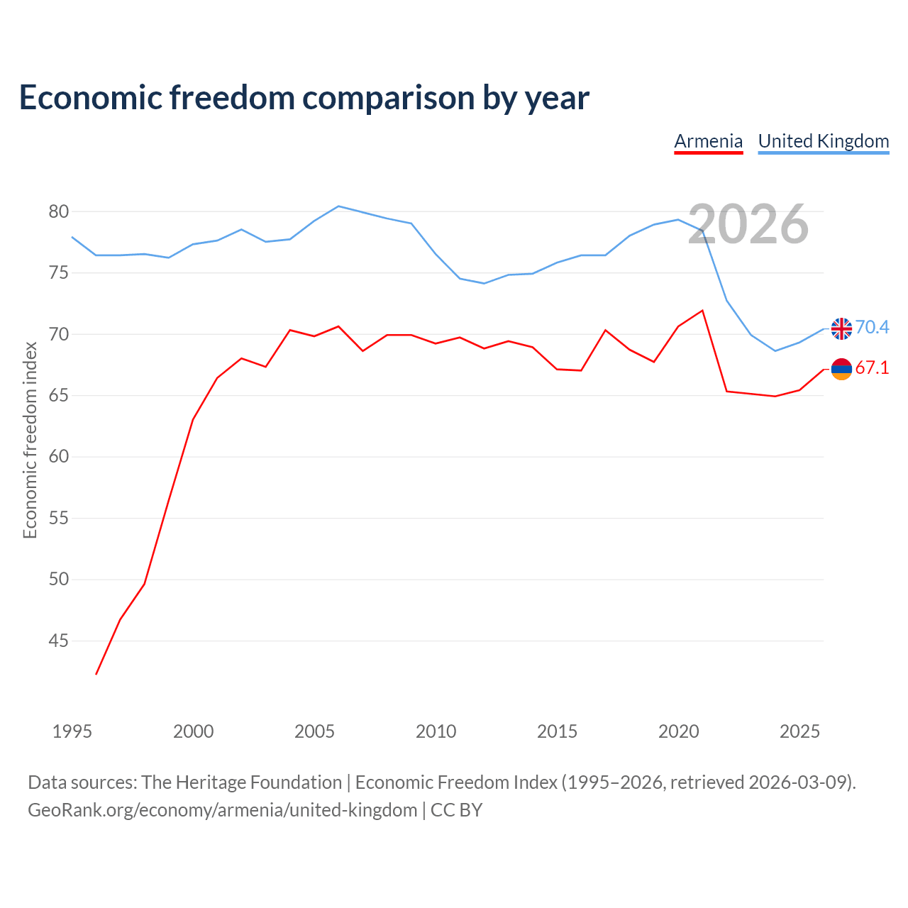 The Economic Freedom Index for Armenia is 67.1, ranking 58/197, compared to 70.4 for the United Kingdom, ranking 35/197. The chart above displays a comparison of annual changes in economic freedom indexes.