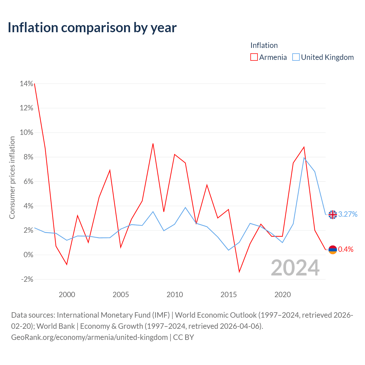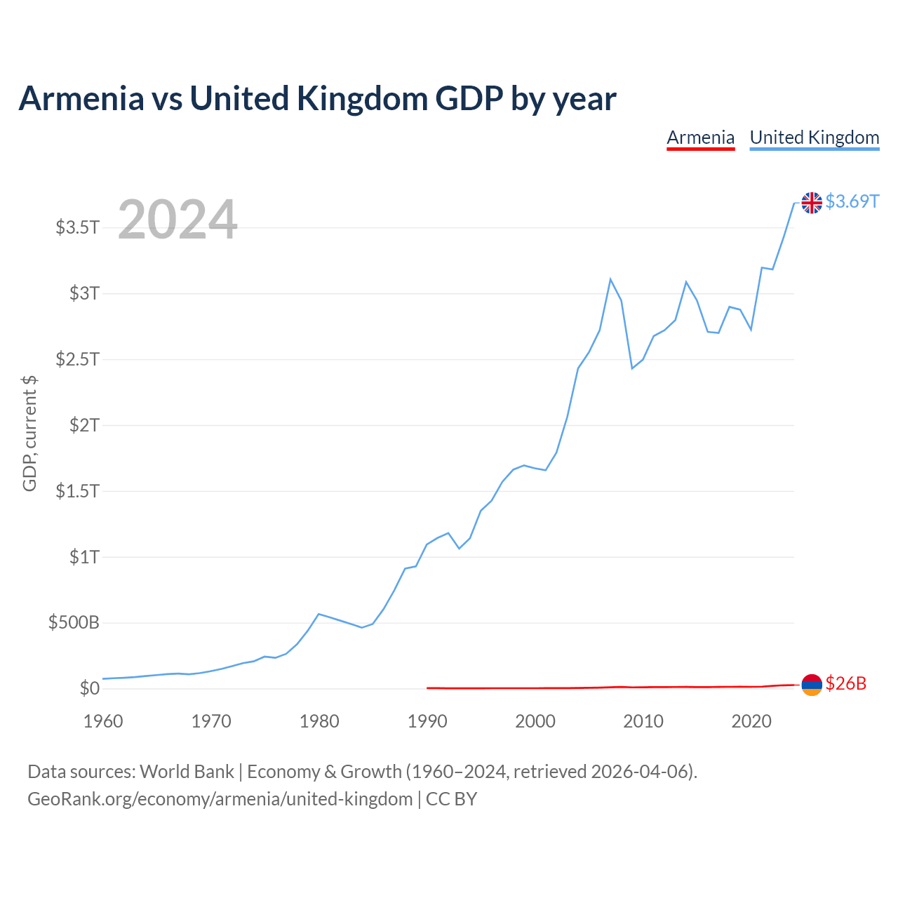 Armenia has a GDP of $26B compared to $3.69T for the United Kingdom, ranking 114/197 and 6/197 by economy size, respectively.