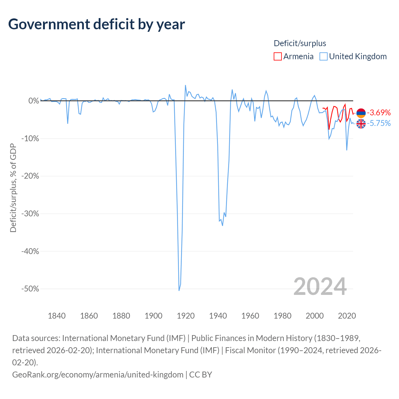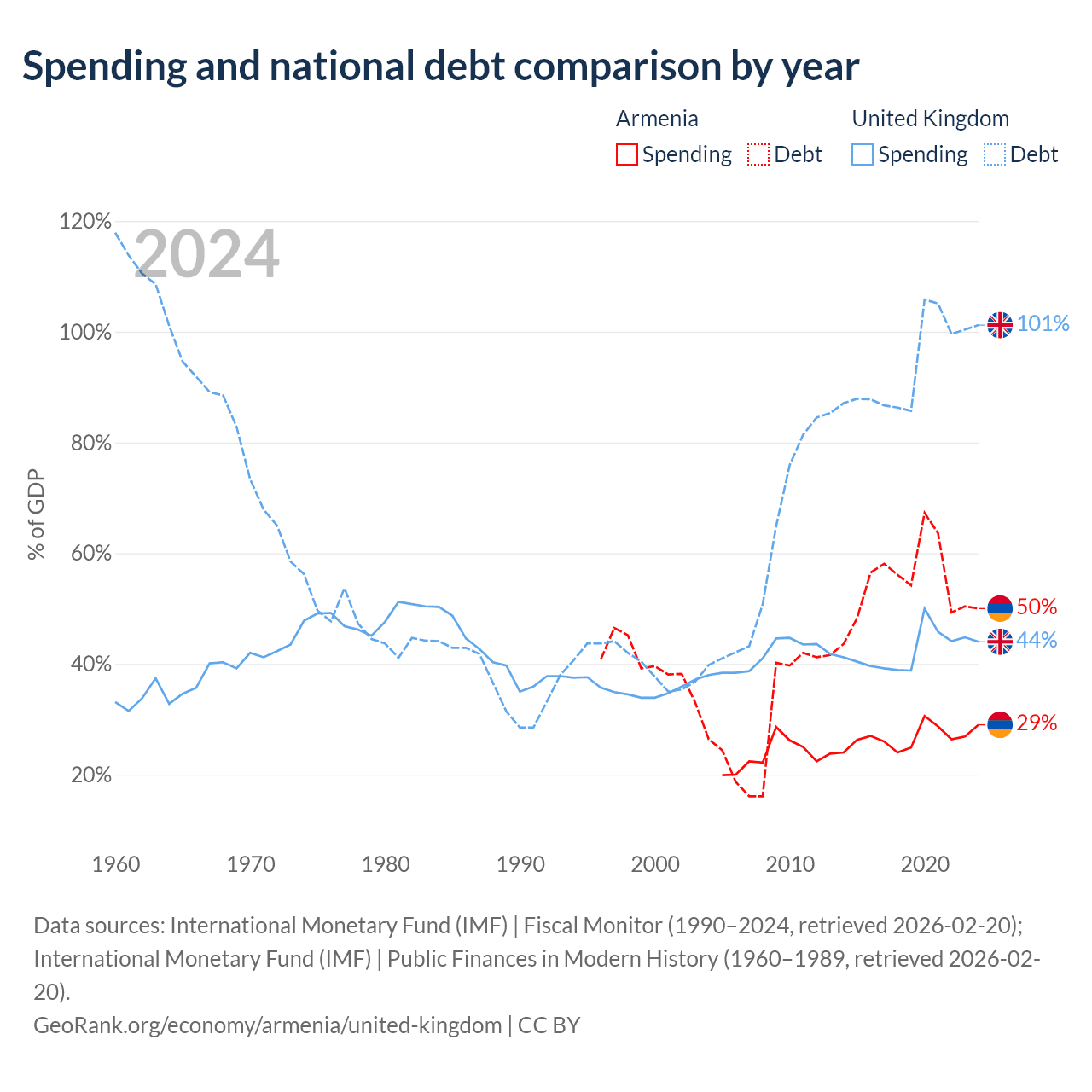 Armenia has $13B in government debt (50% of GDP), compared to $3.73T (101.2% of GDP) in the United Kingdom.