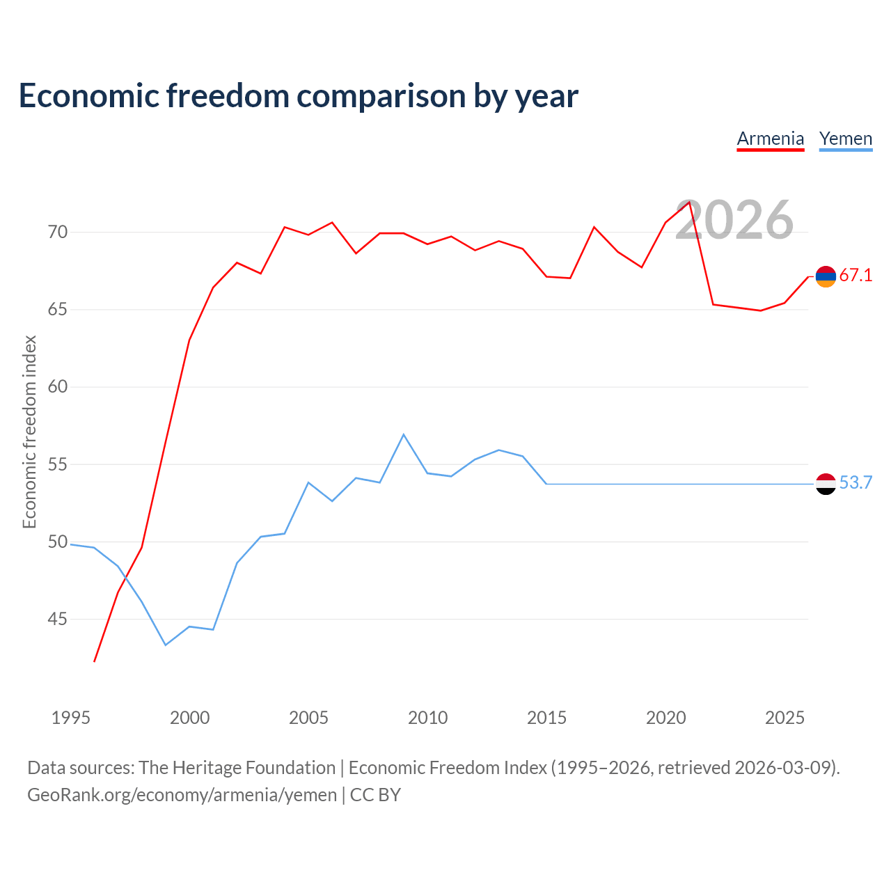 The Economic Freedom Index for Armenia is 67.1, ranking 58/197, compared to 53.7 for Yemen, ranking 138/197. The chart above displays a comparison of annual changes in economic freedom indexes.