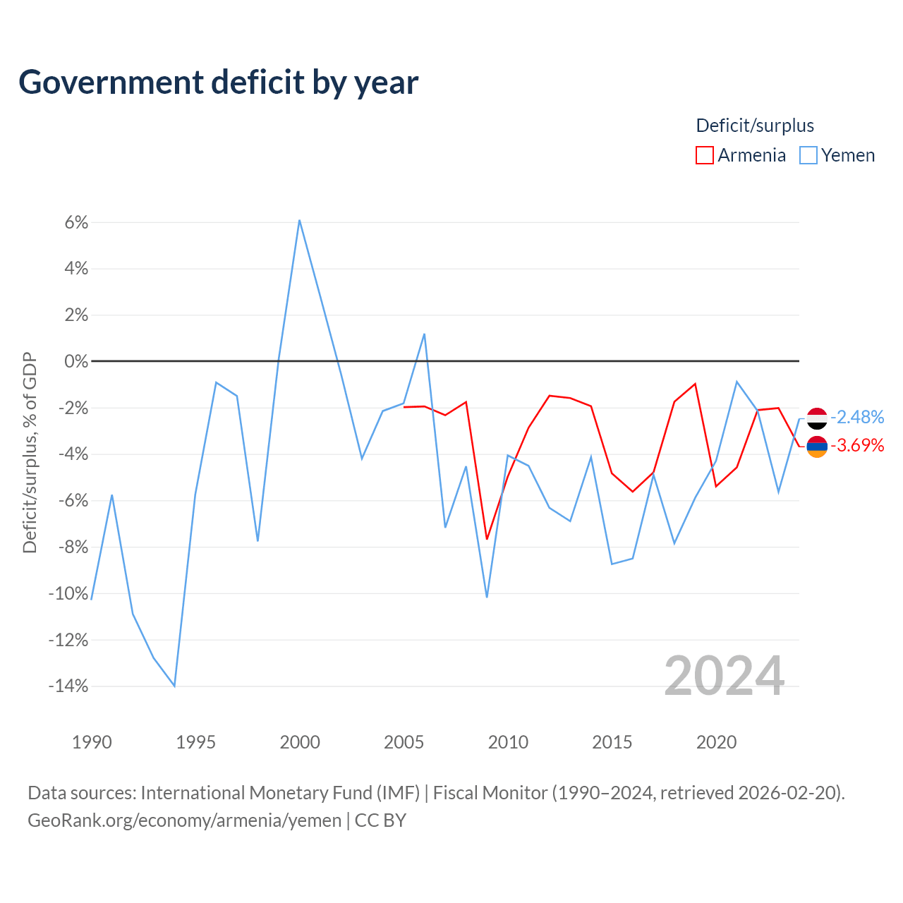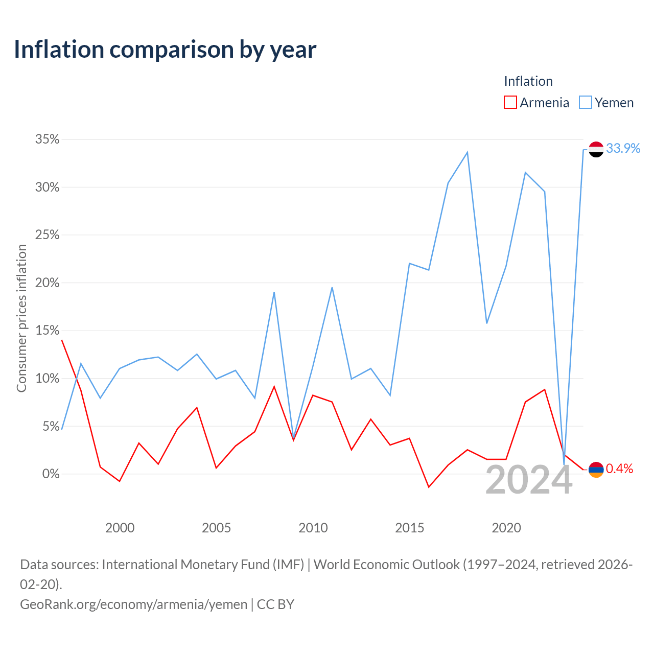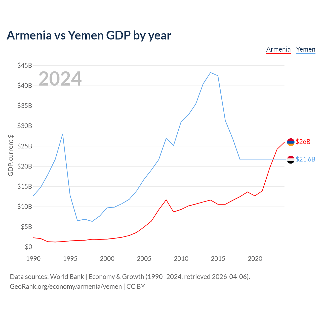 Armenia has a GDP of $26B compared to $21.6B for Yemen, ranking 114/197 and 125/197 by economy size, respectively.