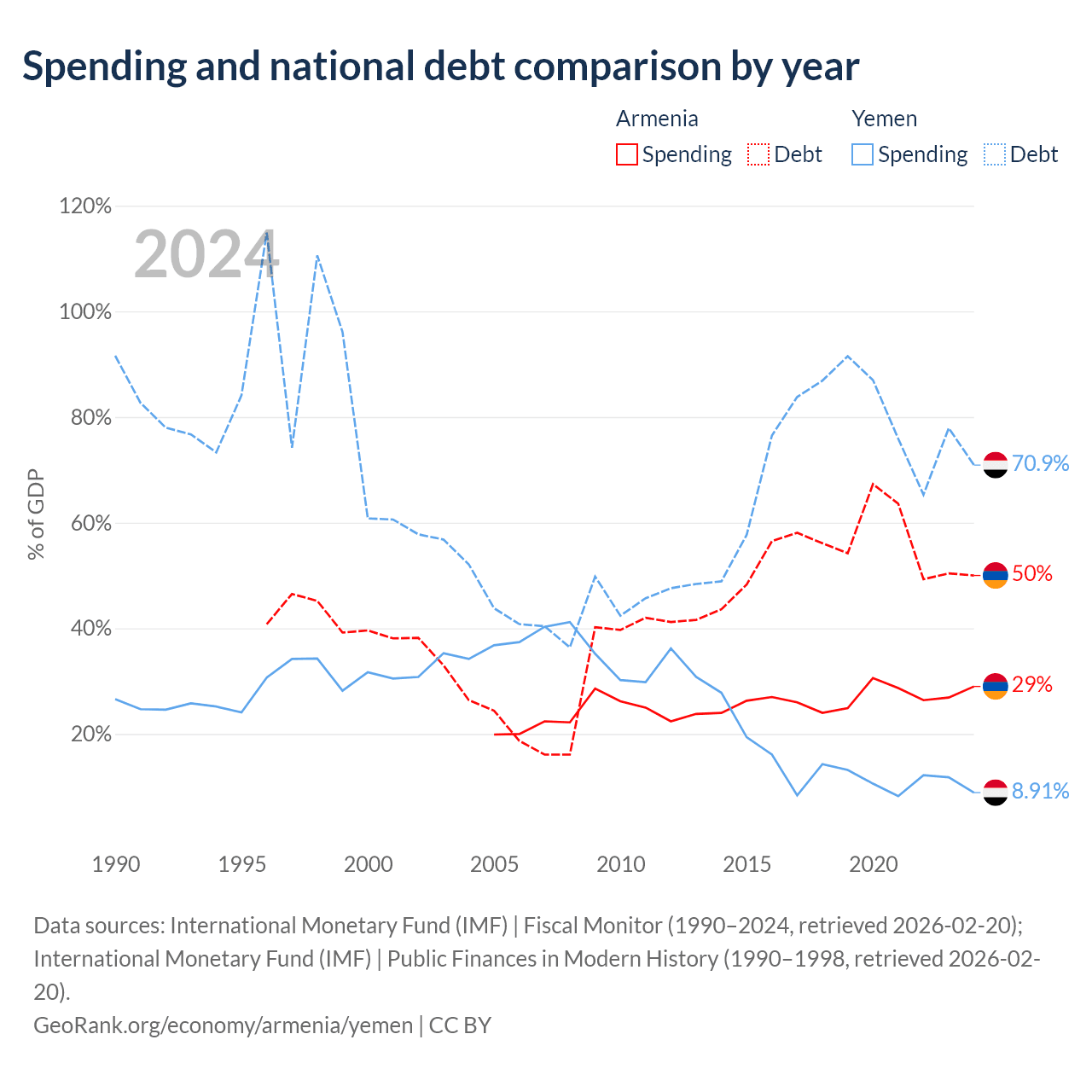 Armenia has $13B in government debt (50% of GDP), compared to $18.8B (70.9% of GDP) in Yemen.