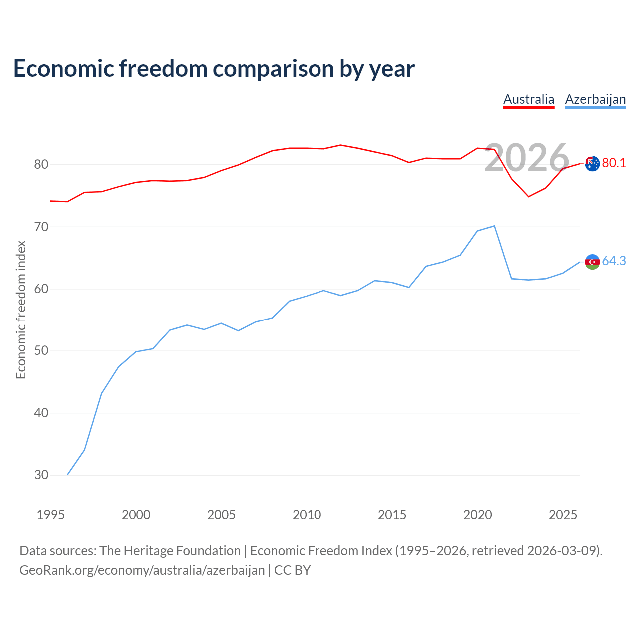 The Economic Freedom Index for Australia is 80.1, ranking 5/197, compared to 64.3 for Azerbaijan, ranking 74/197. The chart above displays a comparison of annual changes in economic freedom indexes.