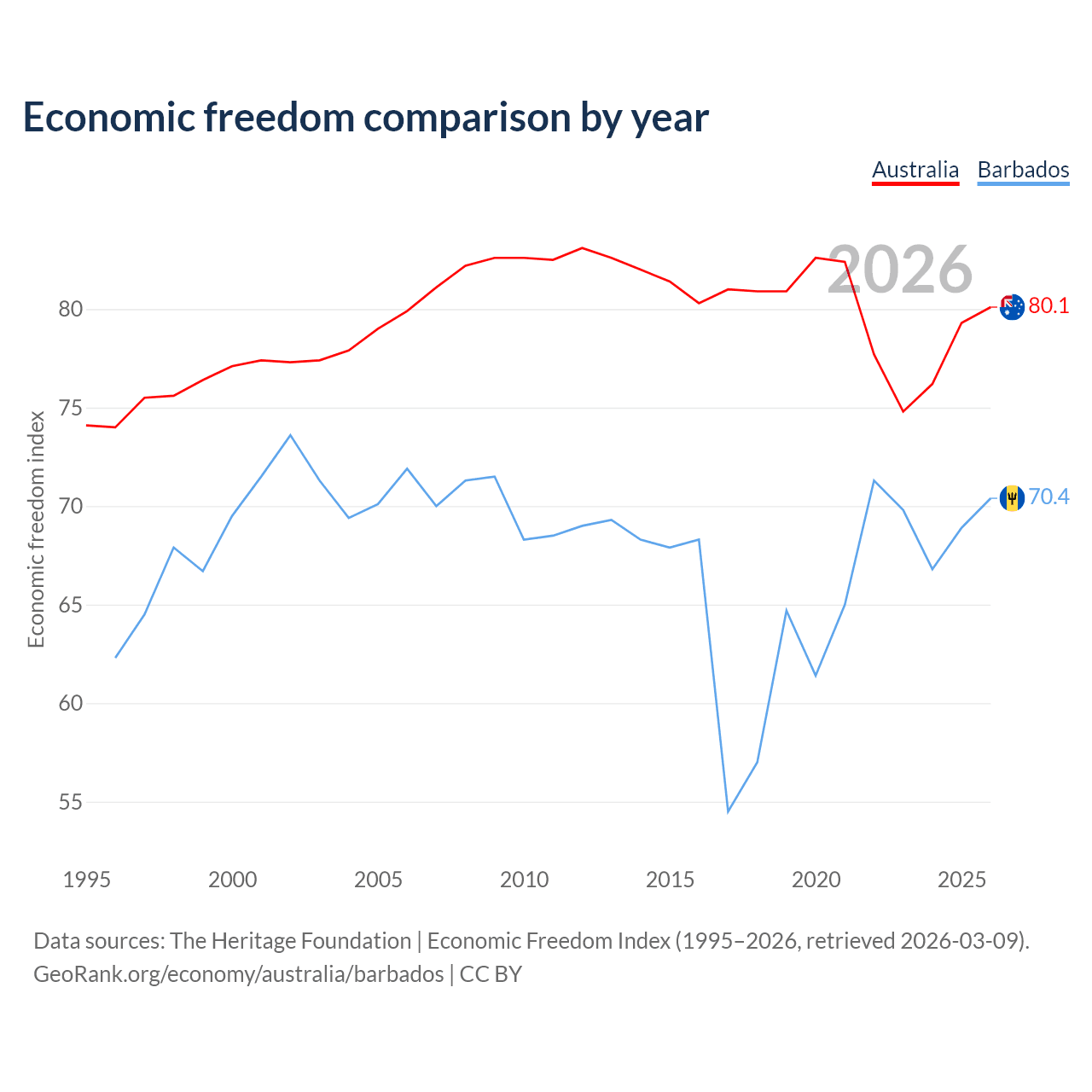 The Economic Freedom Index for Australia is 80.1, ranking 5/197, compared to 70.4 for Barbados, ranking 34/197. The chart above displays a comparison of annual changes in economic freedom indexes.