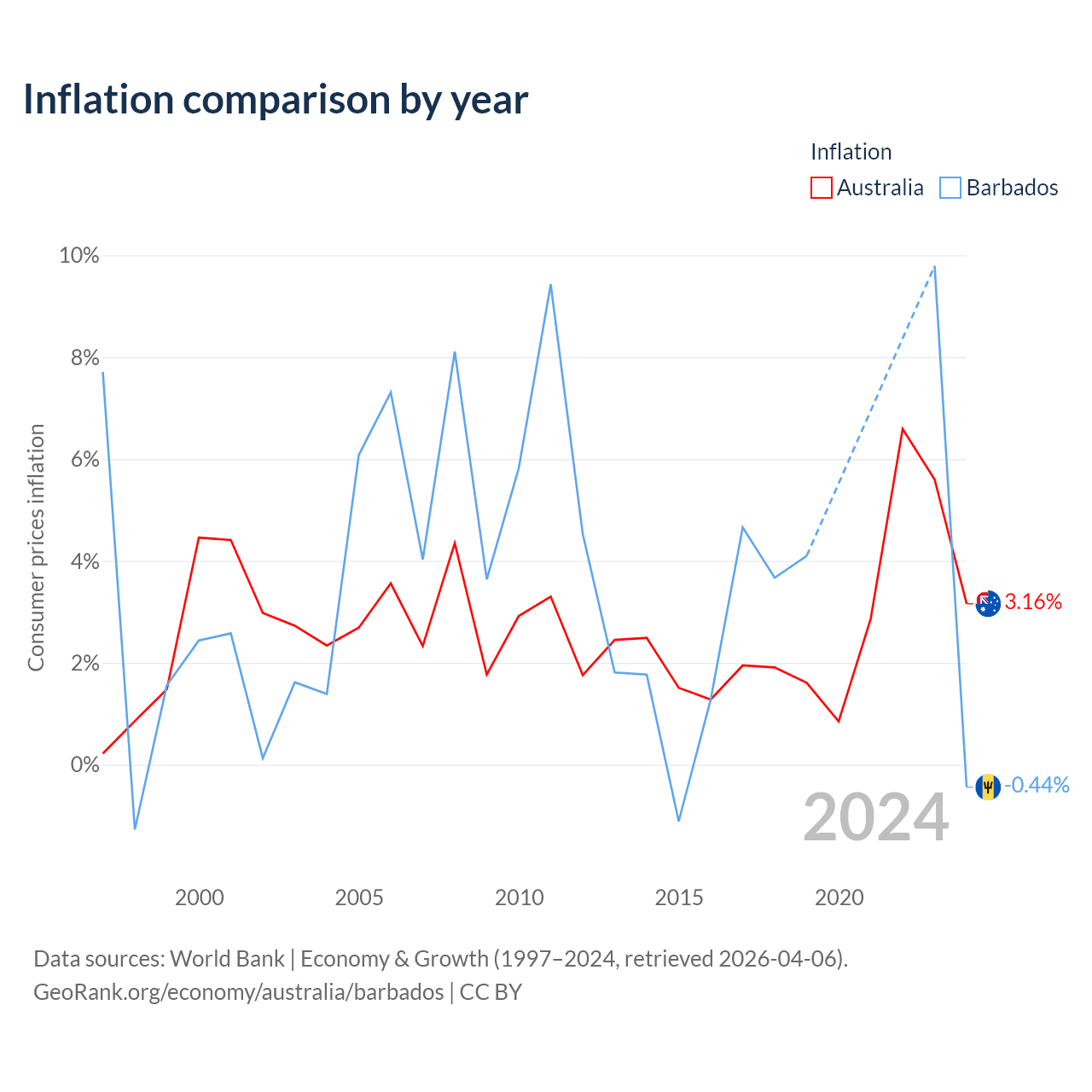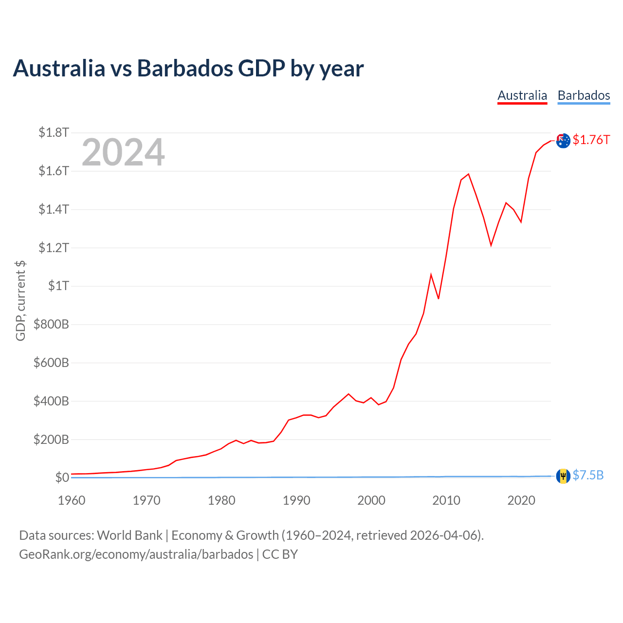 Australia has a GDP of $1.76T compared to $7.5B for Barbados, ranking 14/197 and 157/197 by economy size, respectively.