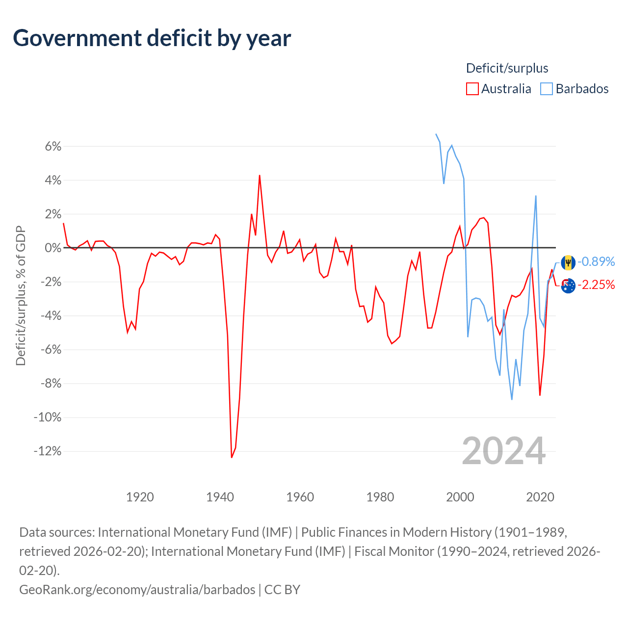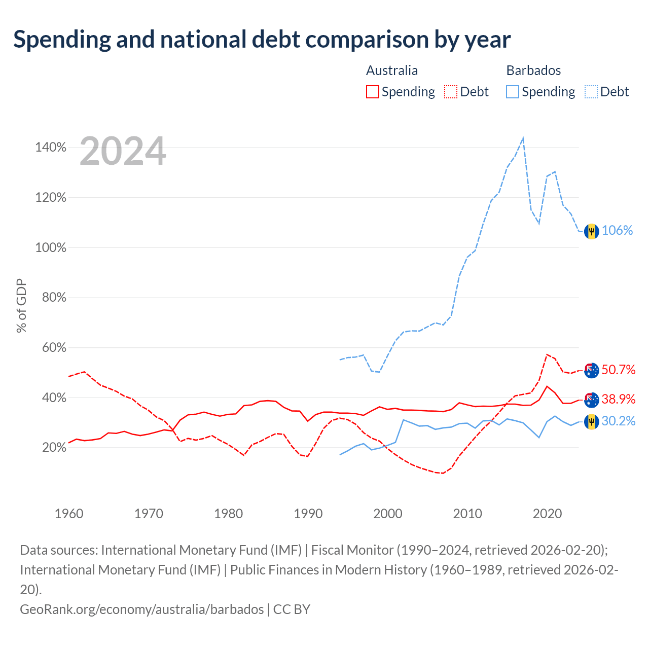 Australia has $891B in government debt (50.7% of GDP), compared to $7.97B (106.3% of GDP) in Barbados.