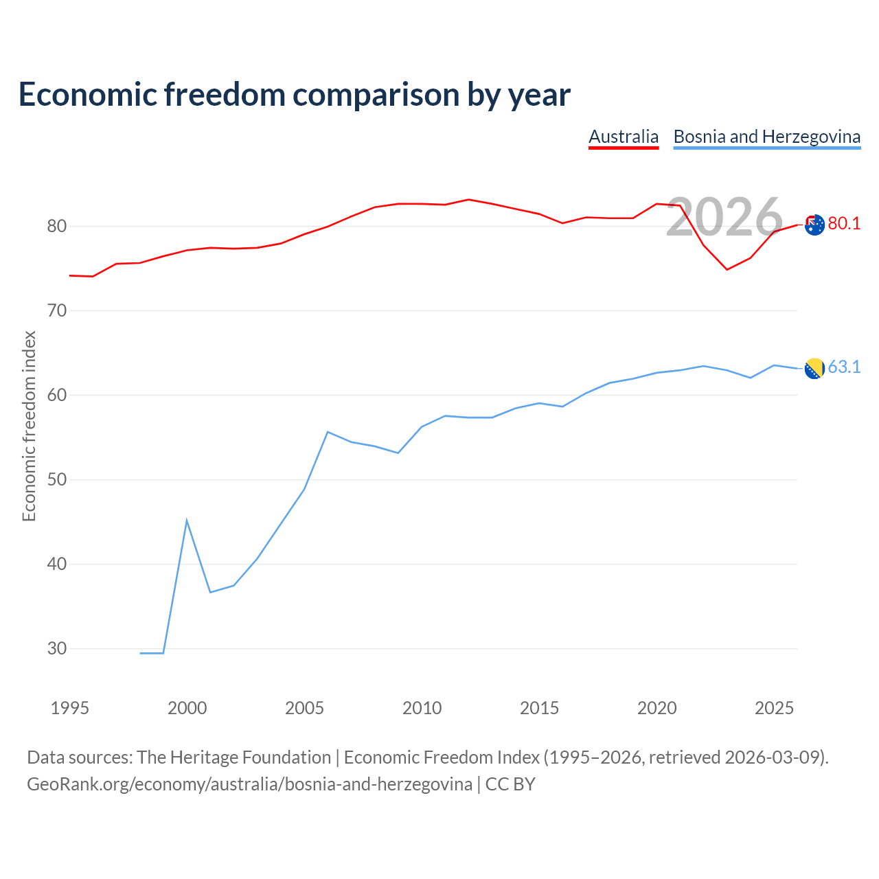 The Economic Freedom Index for Australia is 80.1, ranking 5/197, compared to 63.1 for Bosnia and Herzegovina, ranking 83/197. The chart above displays a comparison of annual changes in economic freedom indexes.