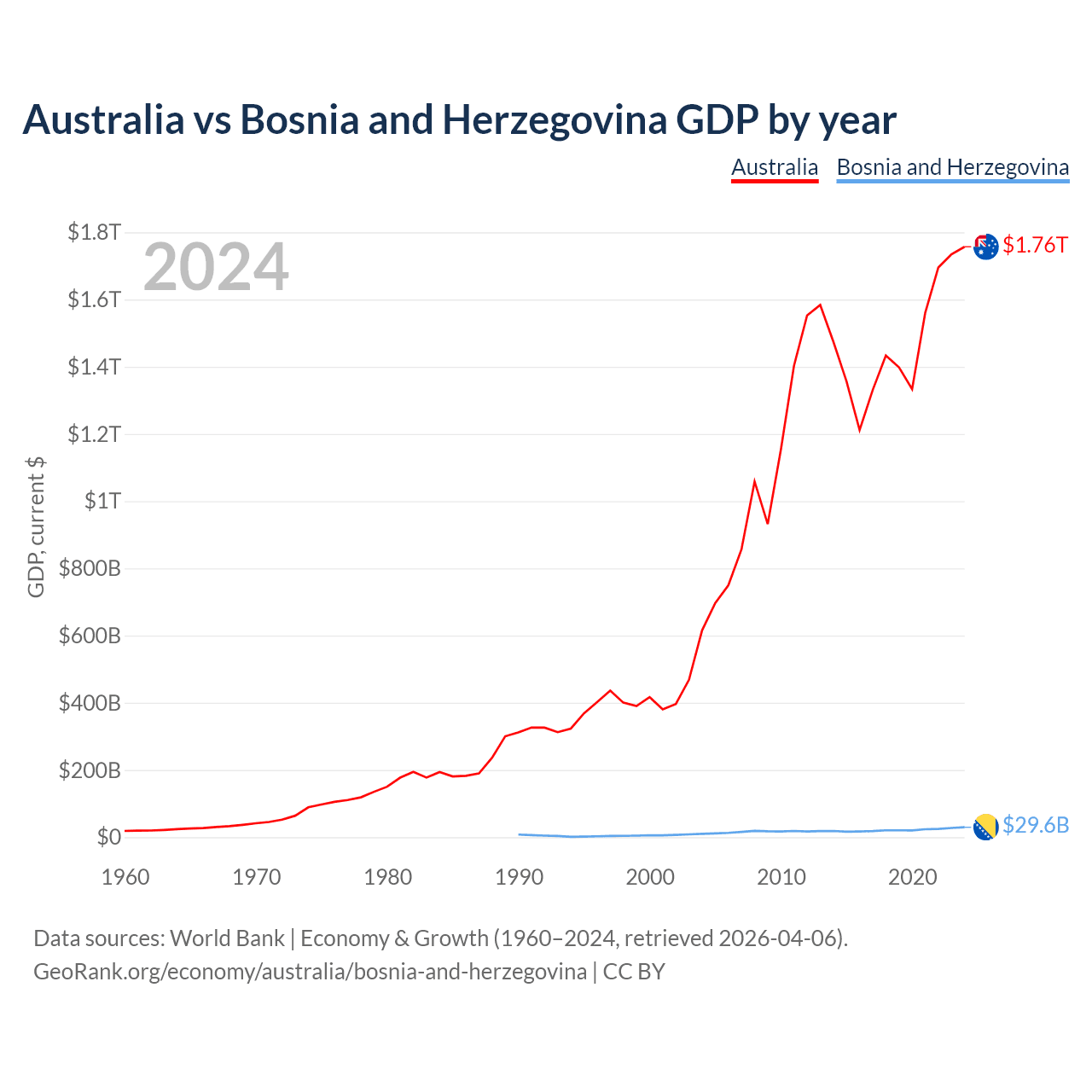 Australia has a GDP of $1.76T compared to $29.6B for Bosnia and Herzegovina, ranking 14/197 and 111/197 by economy size, respectively.