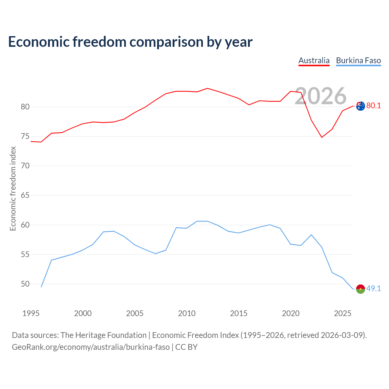 The Economic Freedom Index for Australia is 80.1, ranking 5/197, compared to 49.1 for Burkina Faso, ranking 167/197. The chart above displays a comparison of annual changes in economic freedom indexes.