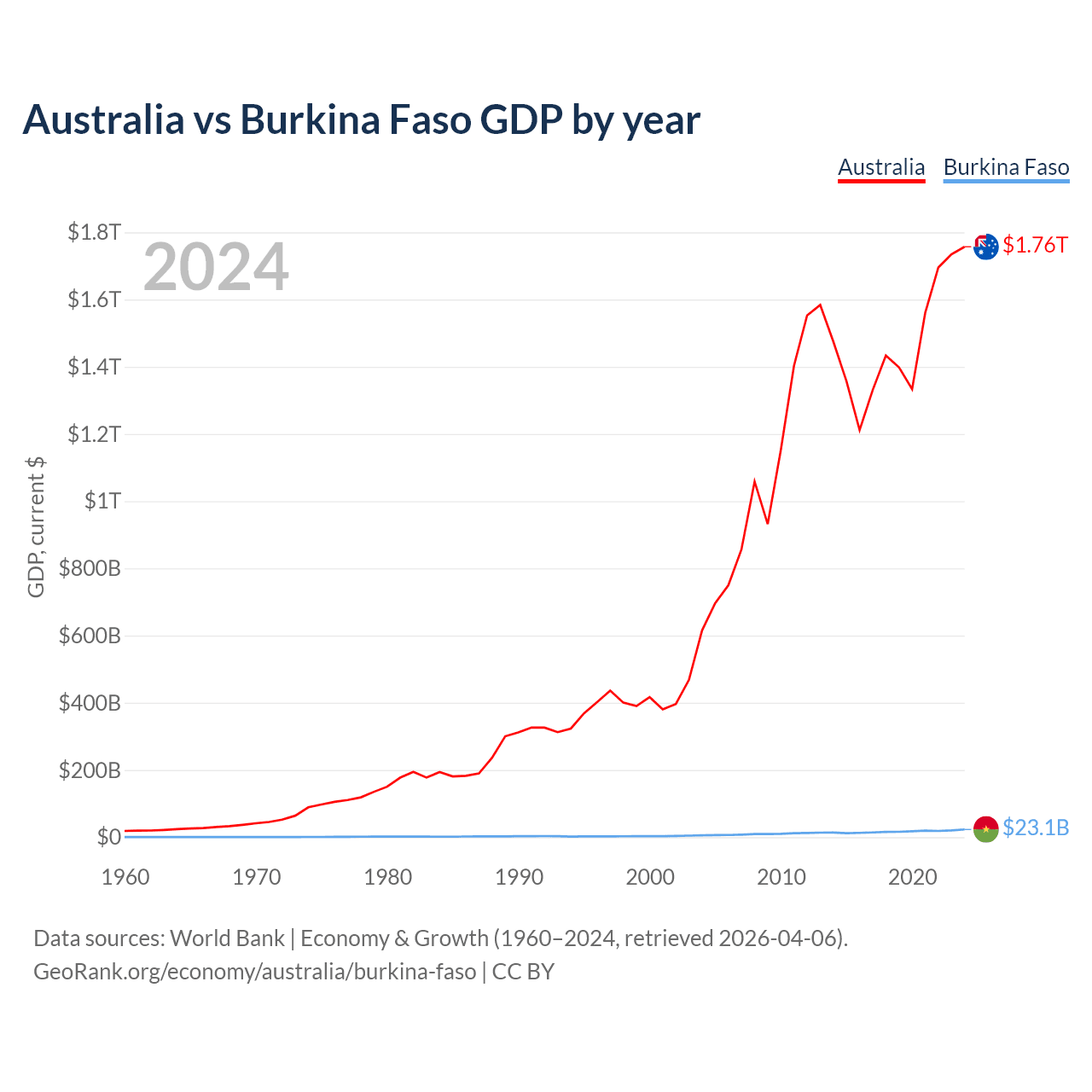 Australia has a GDP of $1.76T compared to $23.1B for Burkina Faso, ranking 14/197 and 122/197 by economy size, respectively.