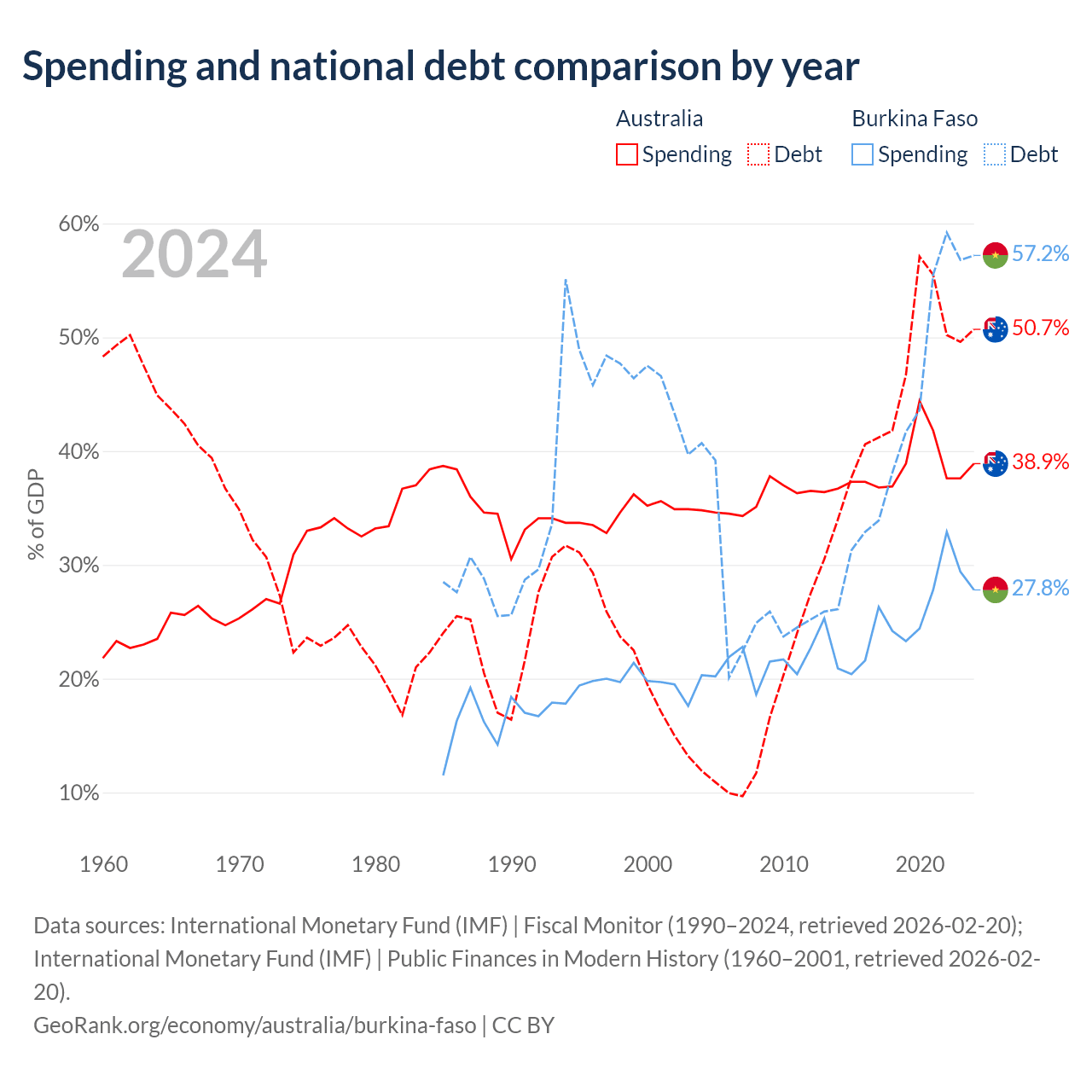 Australia has $891B in government debt (50.7% of GDP), compared to $13.2B (57.2% of GDP) in Burkina Faso.
