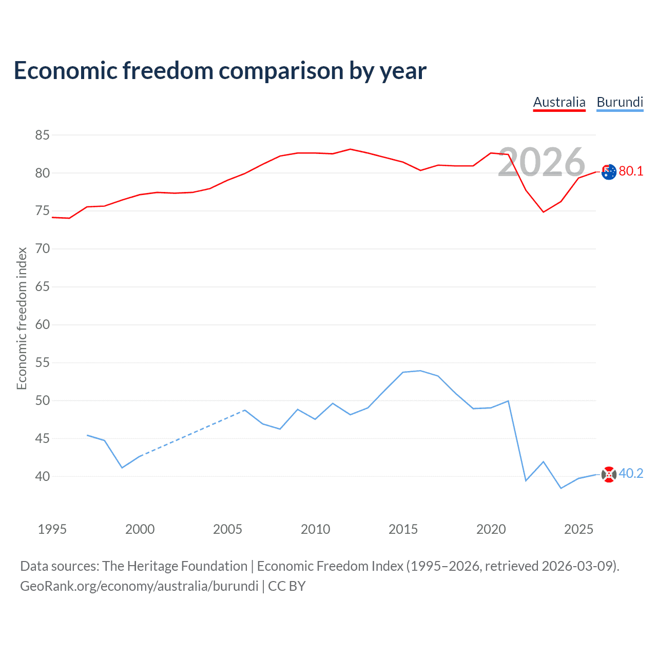 The Economic Freedom Index for Australia is 80.1, ranking 5/197, compared to 40.2 for Burundi, ranking 187/197. The chart above displays a comparison of annual changes in economic freedom indexes.