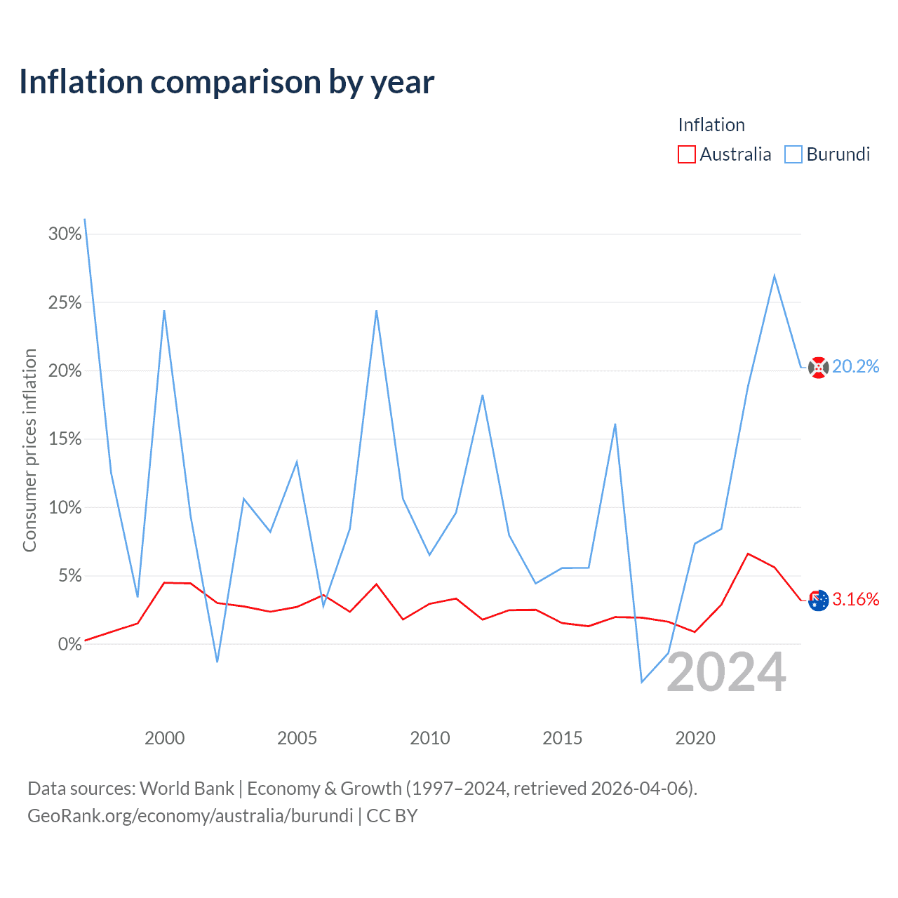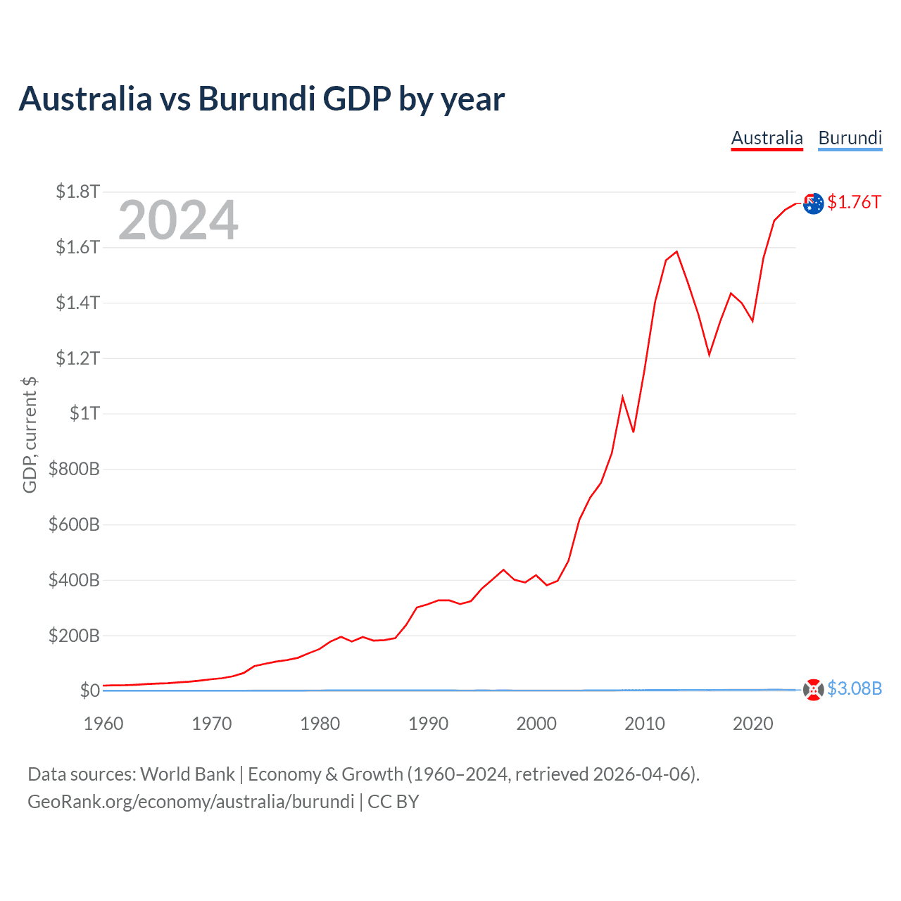 Australia has a GDP of $1.76T compared to $3.08B for Burundi, ranking 14/197 and 169/197 by economy size, respectively.