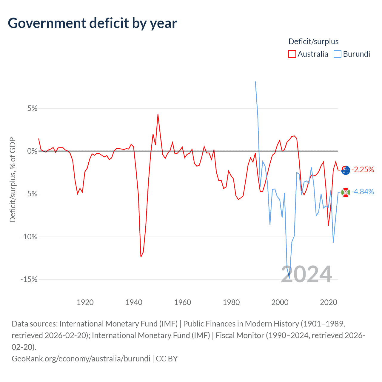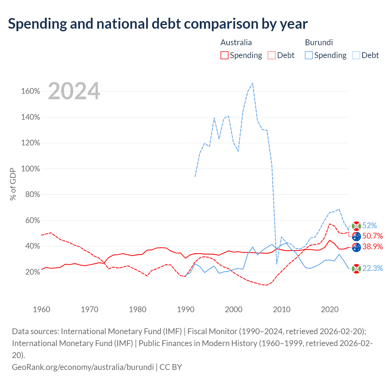 Australia has $891B in government debt (50.7% of GDP), compared to $1.6B (52% of GDP) in Burundi.