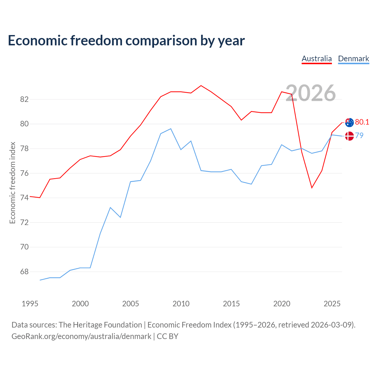 The Economic Freedom Index for Australia is 80.1, ranking 5/197, compared to 79 for Denmark, ranking 8/197. The chart above displays a comparison of annual changes in economic freedom indexes.