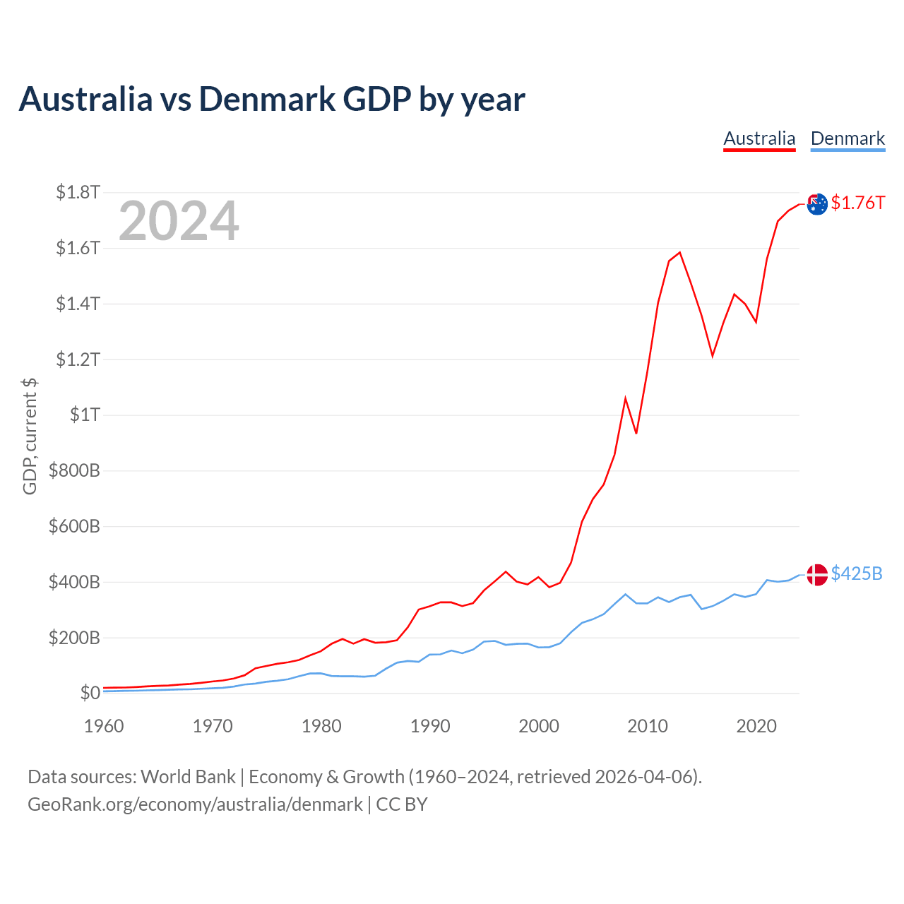 Australia vs Denmark GDP by year