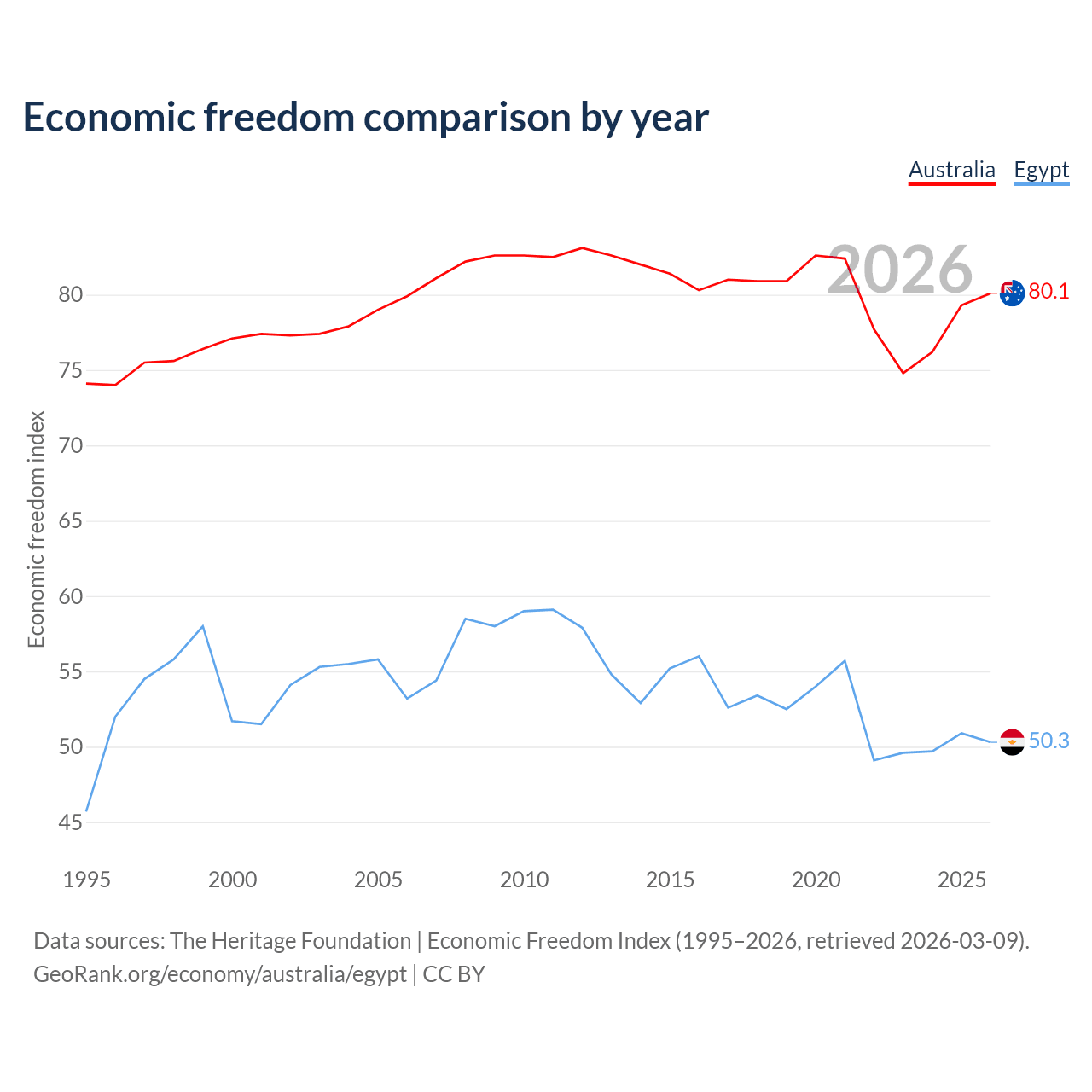 The Economic Freedom Index for Australia is 80.1, ranking 5/197, compared to 50.3 for Egypt, ranking 160/197. The chart above displays a comparison of annual changes in economic freedom indexes.