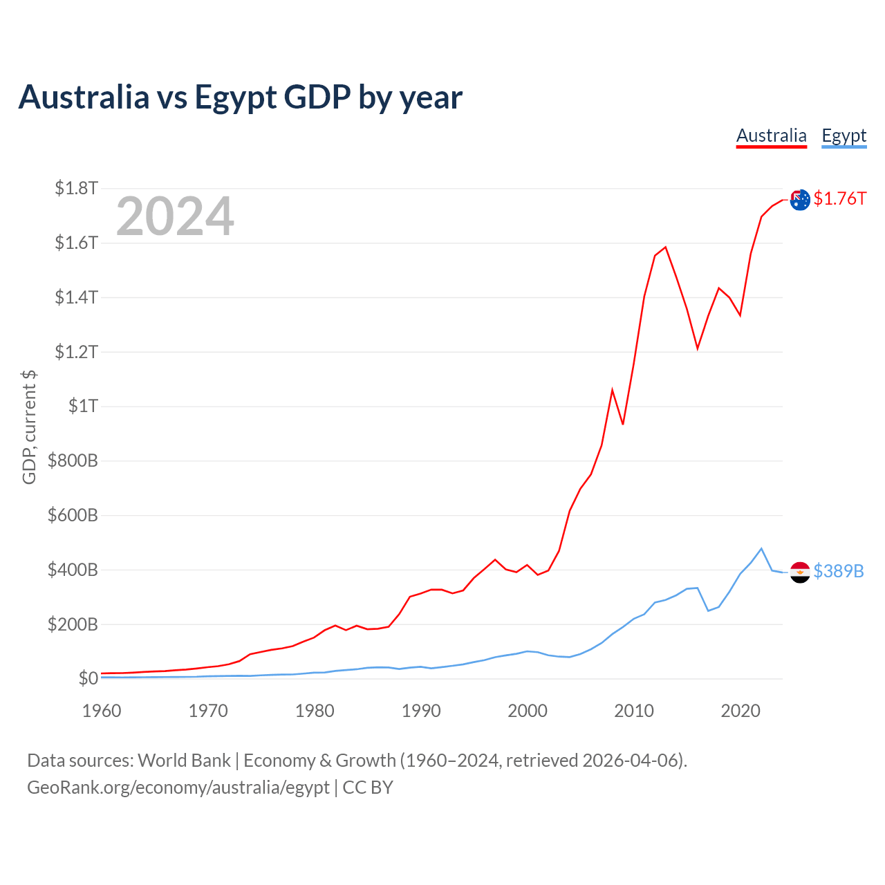 Australia has a GDP of $1.76T compared to $389B for Egypt, ranking 14/197 and 41/197 by economy size, respectively.