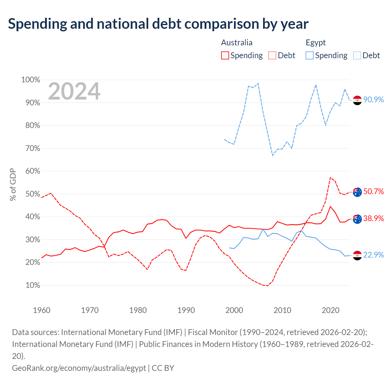Australia has $891B in government debt (50.7% of GDP), compared to $354B (90.9% of GDP) in Egypt.
