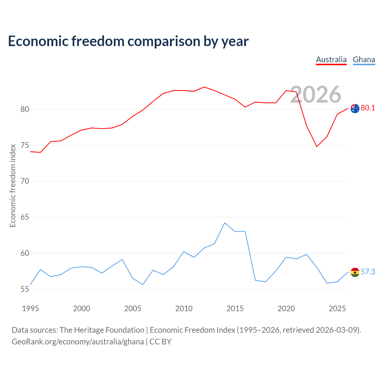 The Economic Freedom Index for Australia is 80.1, ranking 5/197, compared to 57.3 for Ghana, ranking 118/197. The chart above displays a comparison of annual changes in economic freedom indexes.