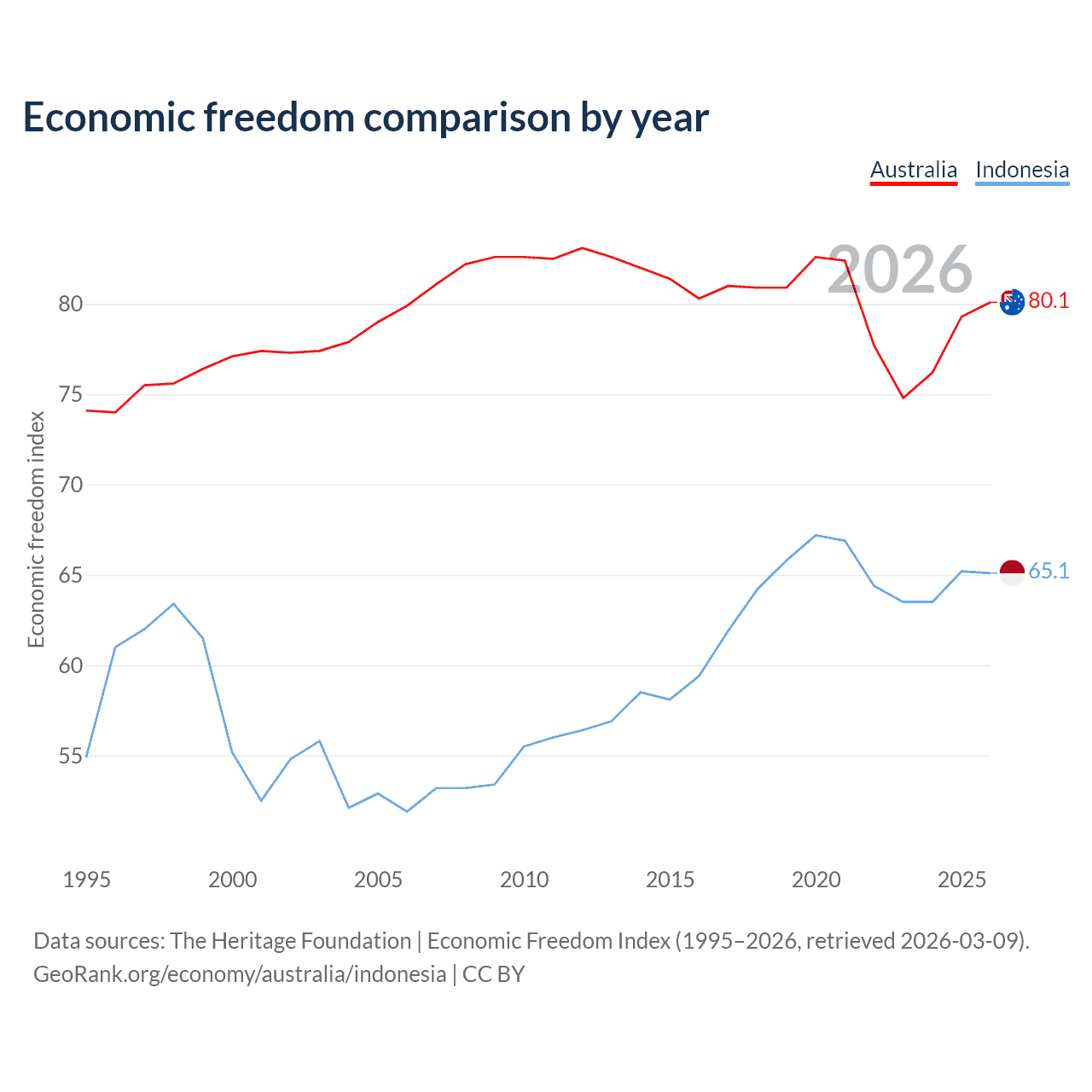 The Economic Freedom Index for Australia is 80.1, ranking 5/197, compared to 65.1 for Indonesia, ranking 67/197. The chart above displays a comparison of annual changes in economic freedom indexes.