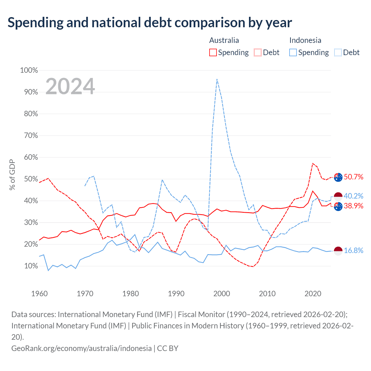 Australia has $891B in government debt (50.7% of GDP), compared to $561B (40.2% of GDP) in Indonesia.