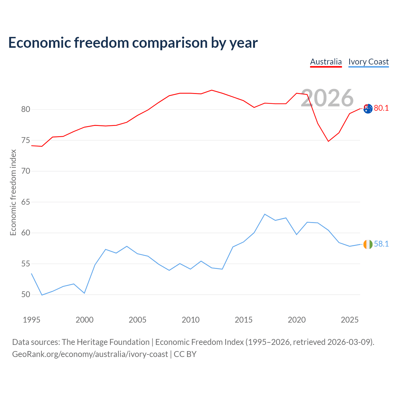 The Economic Freedom Index for Australia is 80.1, ranking 5/197, compared to 58.1 for Ivory Coast, ranking 111/197. The chart above displays a comparison of annual changes in economic freedom indexes.