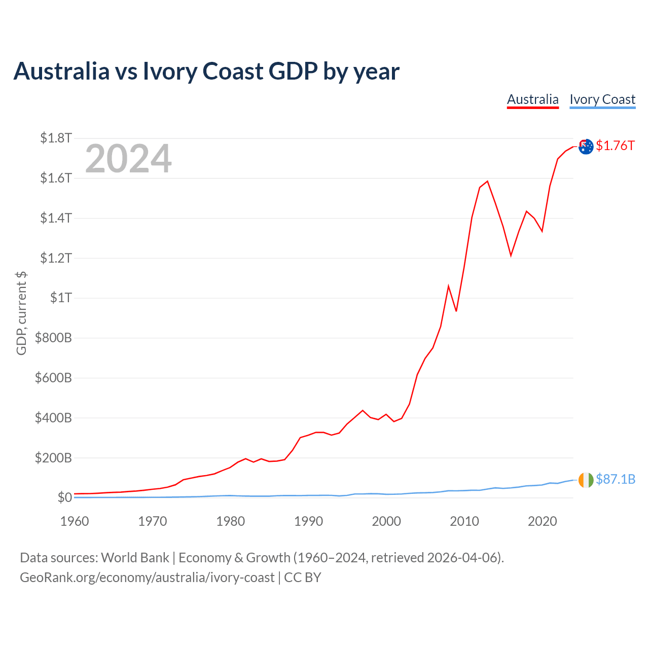 Australia has a GDP of $1.76T compared to $87.1B for Ivory Coast, ranking 14/197 and 77/197 by economy size, respectively.