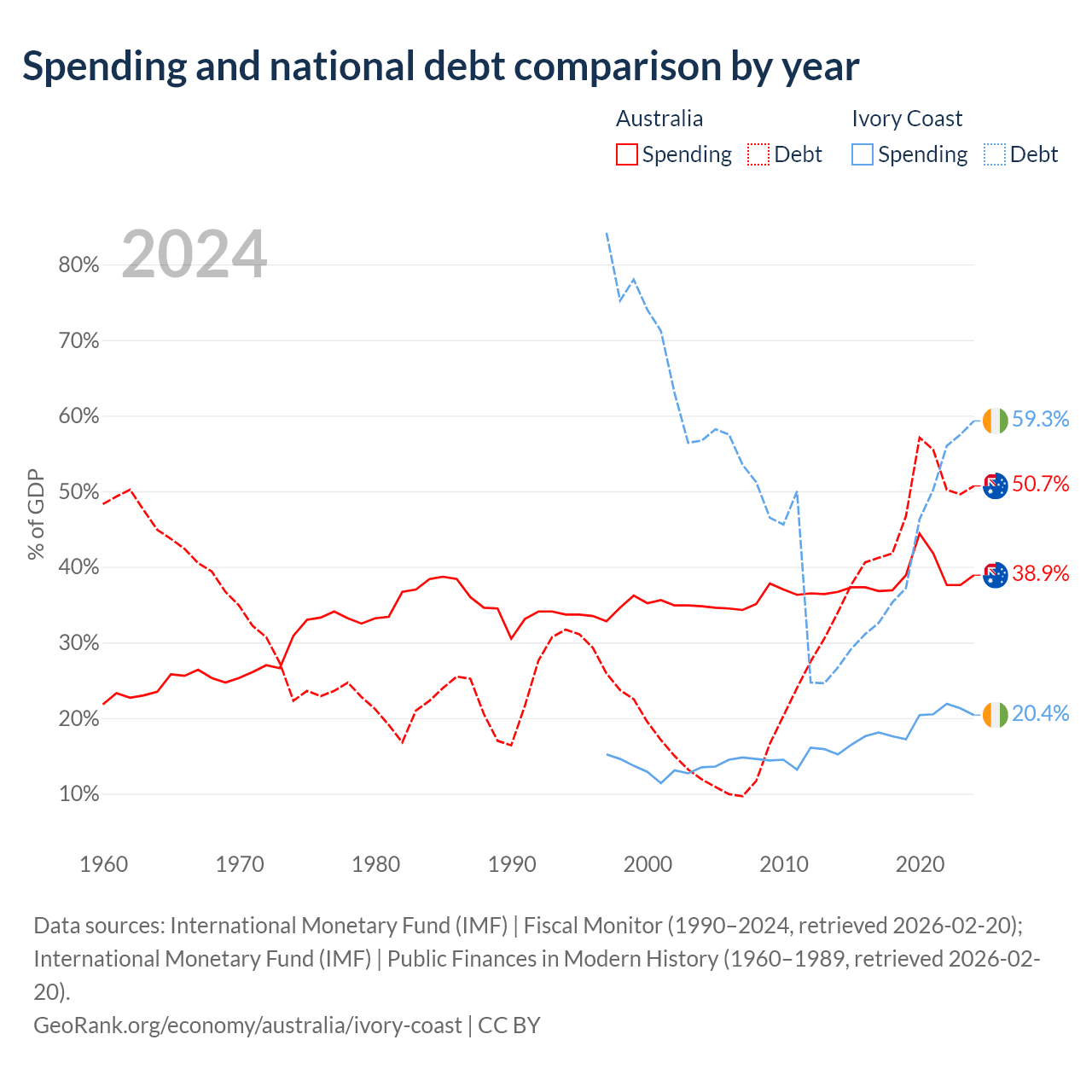 Australia has $891B in government debt (50.7% of GDP), compared to $51.6B (59.3% of GDP) in Ivory Coast.